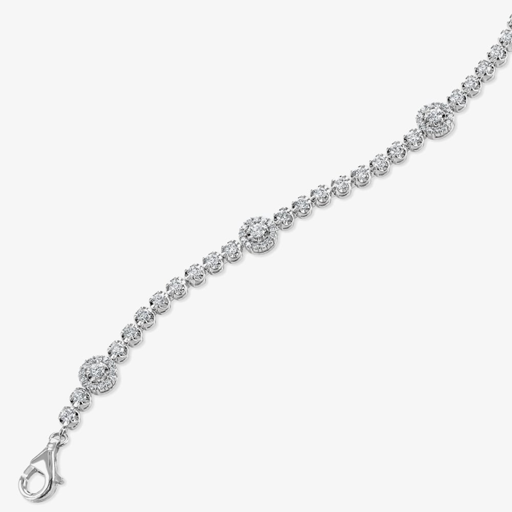 This sophisticated bracelet is crafted in 18ct white gold & features a total of 2.50ct of round diamonds in an alternating illusion set & halo cluster design which catches the light beautifully. This bracelet is finished with a lobster style clasp fastening. A contemporary & stylish bracelet to add a touch of sparkle to any outfit.