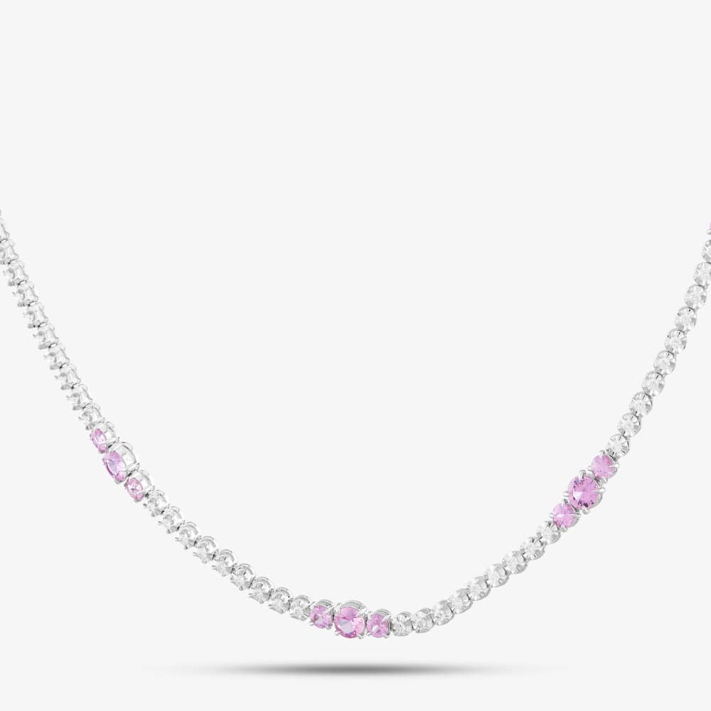 This unique necklace showcases a stunning half tennis design adorned with sparkling pink sapphires, totalling 2.75 carats. The other half features a stylish ball chain, adding a modern twist to the classic tennis necklace silhouette. Stunning brilliant cut diamonds, totalling 0.60 carats, accentuate the beauty of the pink sapphires, creating a mesmerising contrast of colour and brilliance.