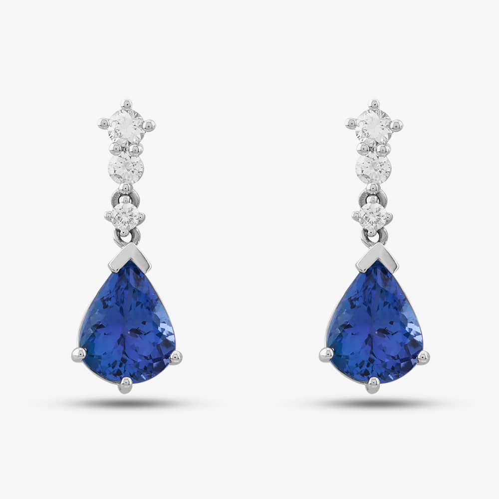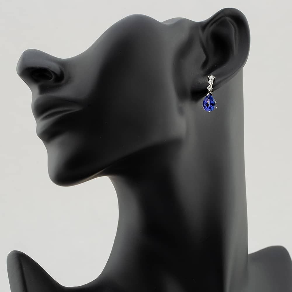 At the heart of each earring is a pear-cut tanzanite, totalling 3.40 carats in the pair. The tanzanite’s radiate a mesmerising blue hue, evoking a sense of luxury and elegance. Above each tanzanite are three brilliant-cut diamonds, totalling 0.37 carats in the pair, adding a brilliant sparkle and further enhancing the allure of the earrings.