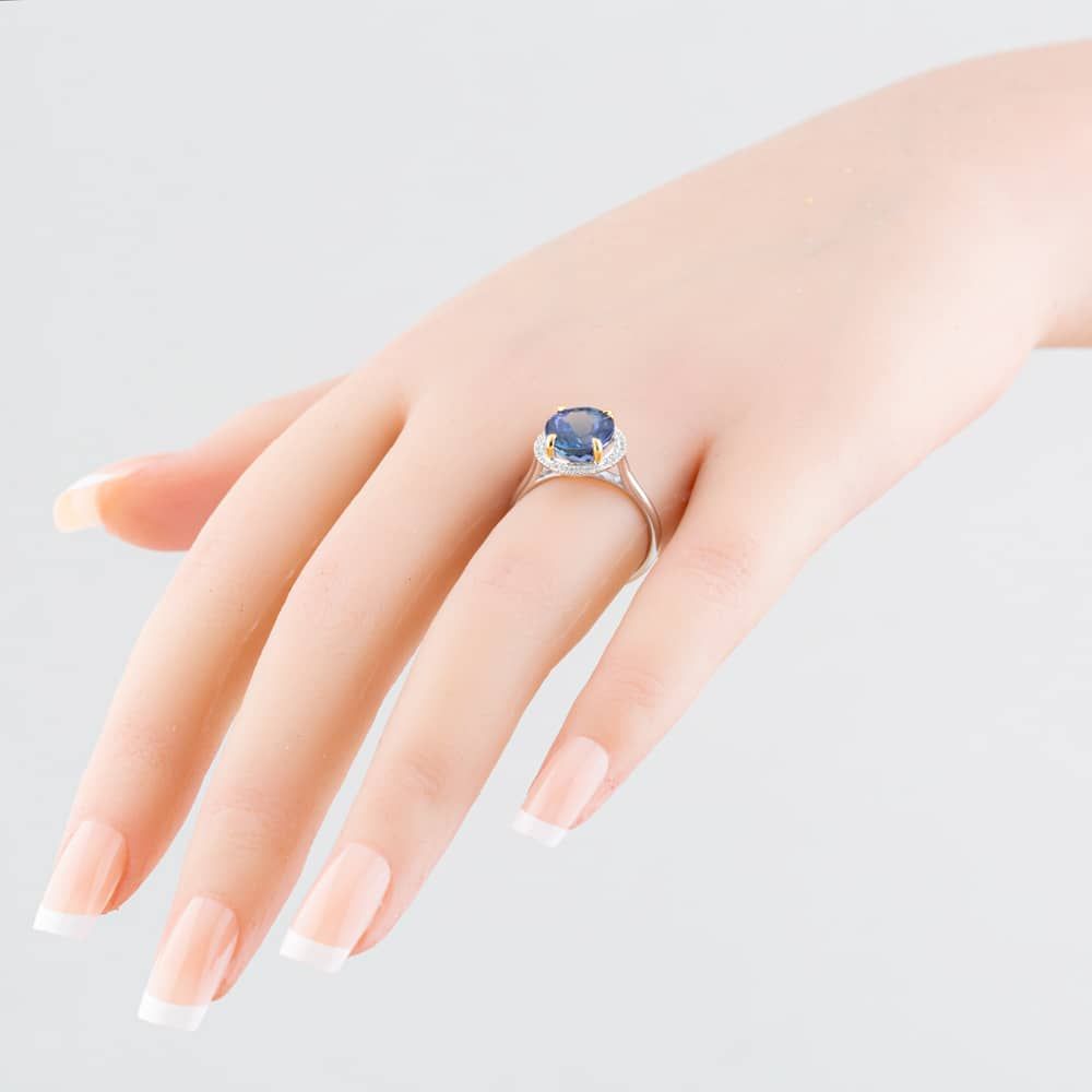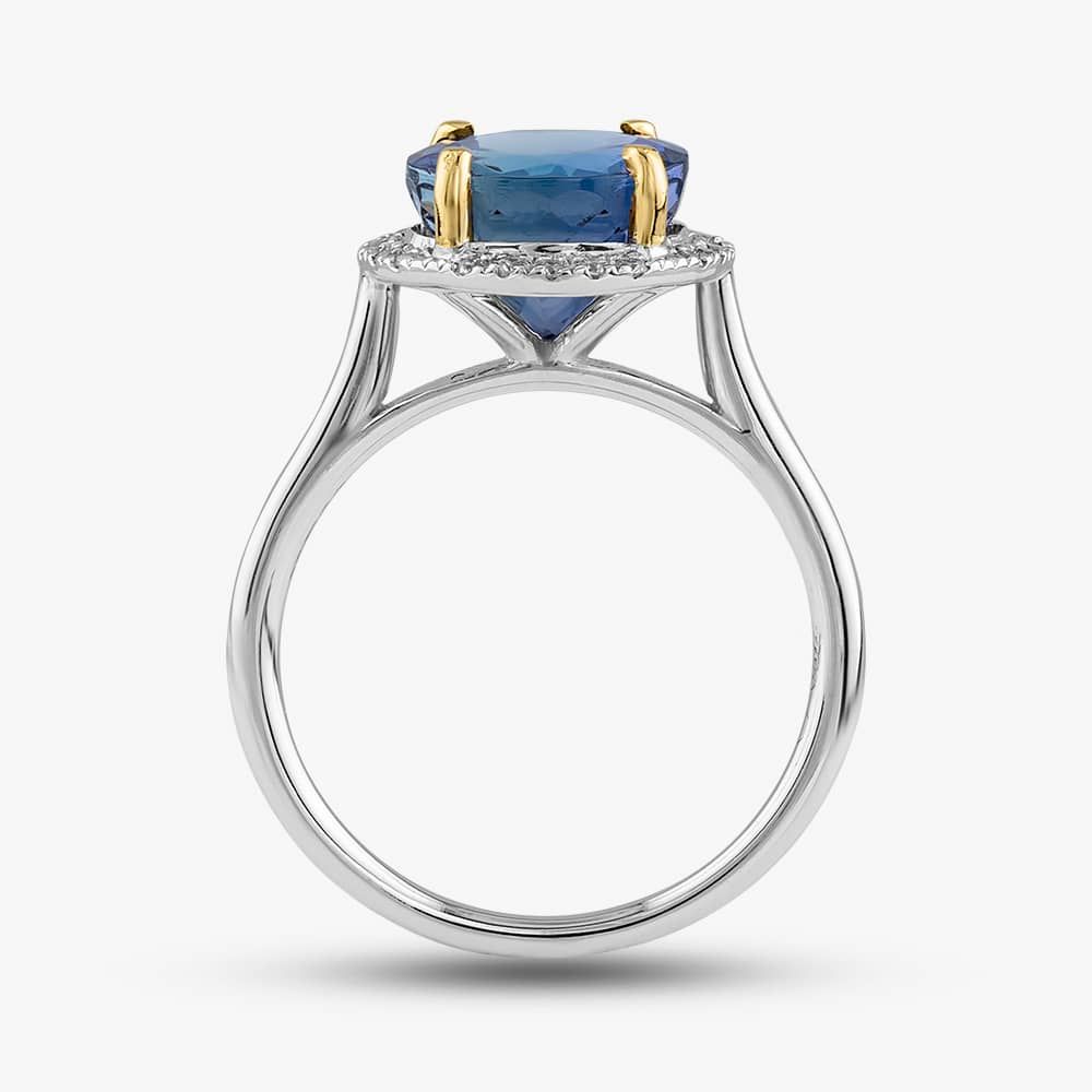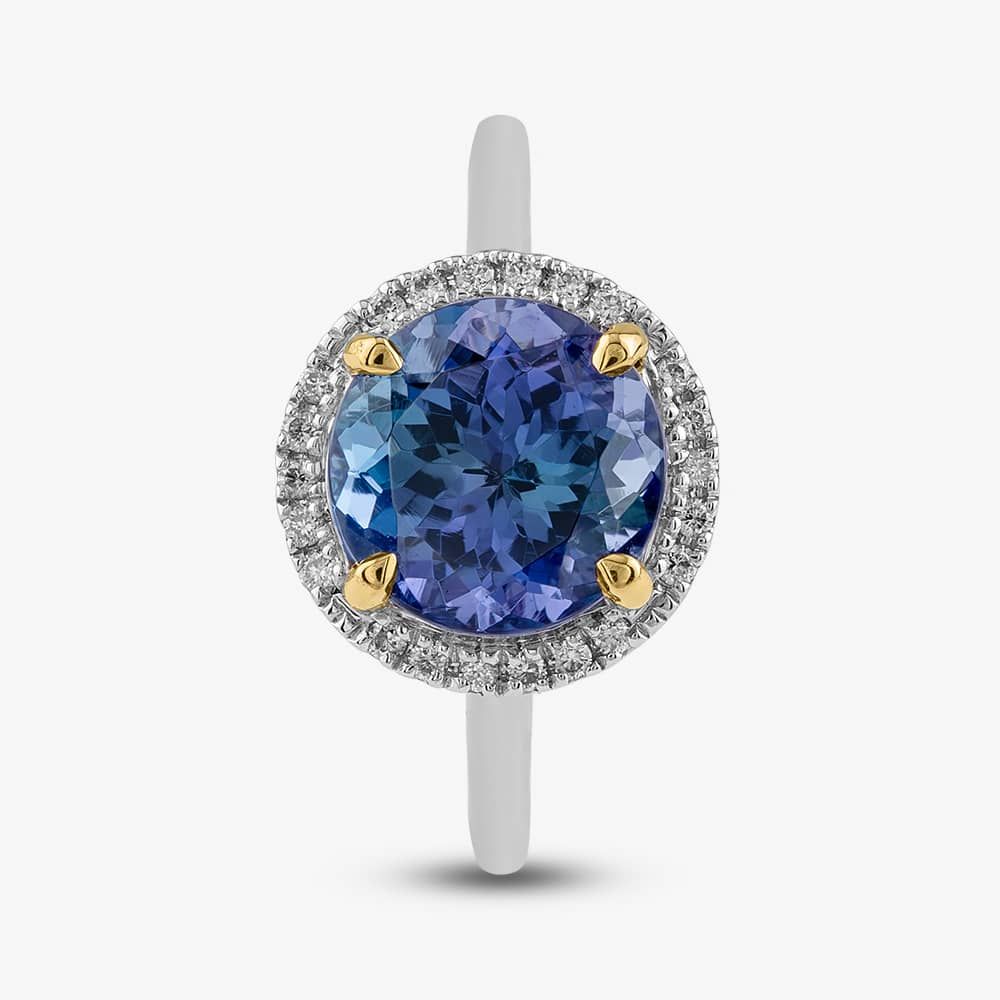Crafted with a touch of simplicity, this halo ring exudes timeless elegance. Delicate 18ct white gold embraces a 3.51ct brilliant-cut two-colour tanzanite centre stone, accentuated with a 0.12ct brilliant-cut white diamond halo. The perfect accompaniment for any special occasion, this ring promises to leave a lasting impression.
