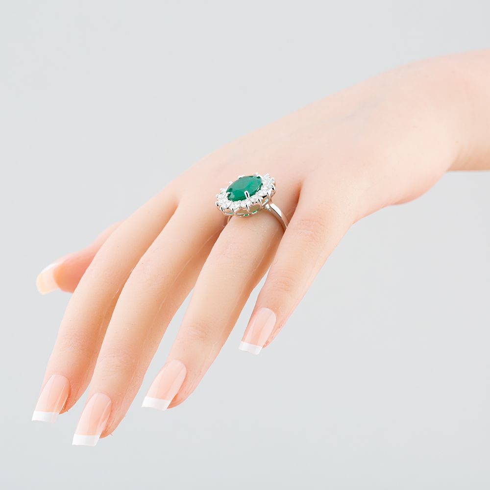 A unique 18ct white gold ring showcasing a stunning 4.22ct oval cut emerald at its centre, surrounded by a halo of glittering 1.80ct brilliant cut diamonds, this is a must own for any jewellery collection and will make the perfect gift for yourself or a loved one.
