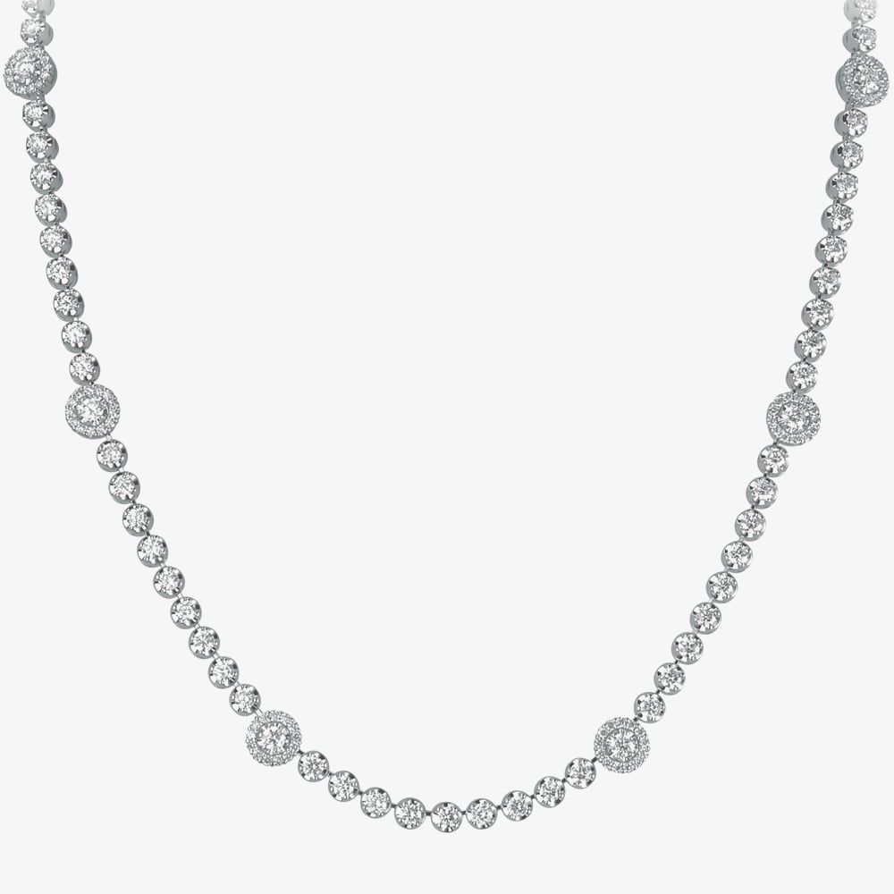 This statement halo cluster tennis style necklace is crafted in 18ct white gold & features 4.30ct of brilliant cut diamonds which catch the light beautifully. A contemporary & stylish necklace to add a touch of sparkle to any outfit.