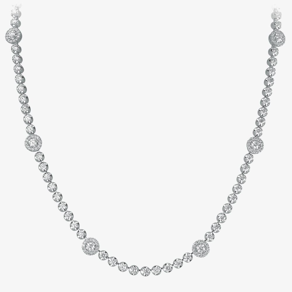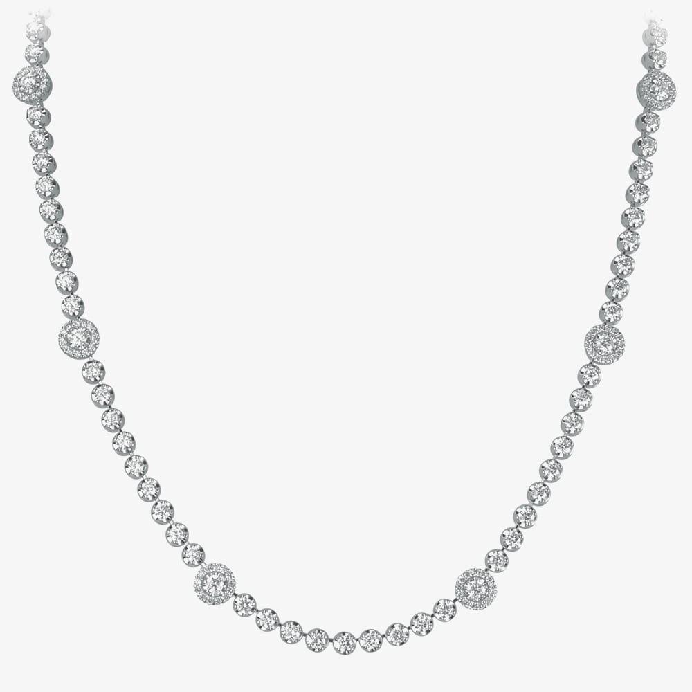 This statement halo cluster tennis style necklace is crafted in 18ct white gold & features 4.30ct of brilliant cut diamonds which catch the light beautifully. A contemporary & stylish necklace to add a touch of sparkle to any outfit.