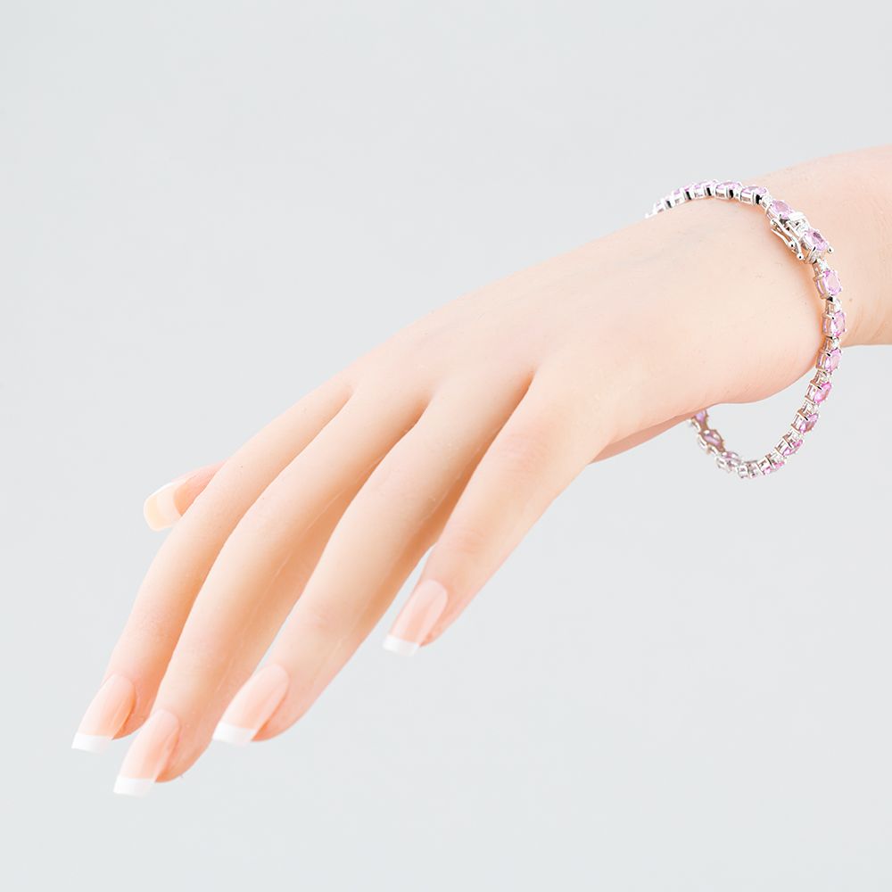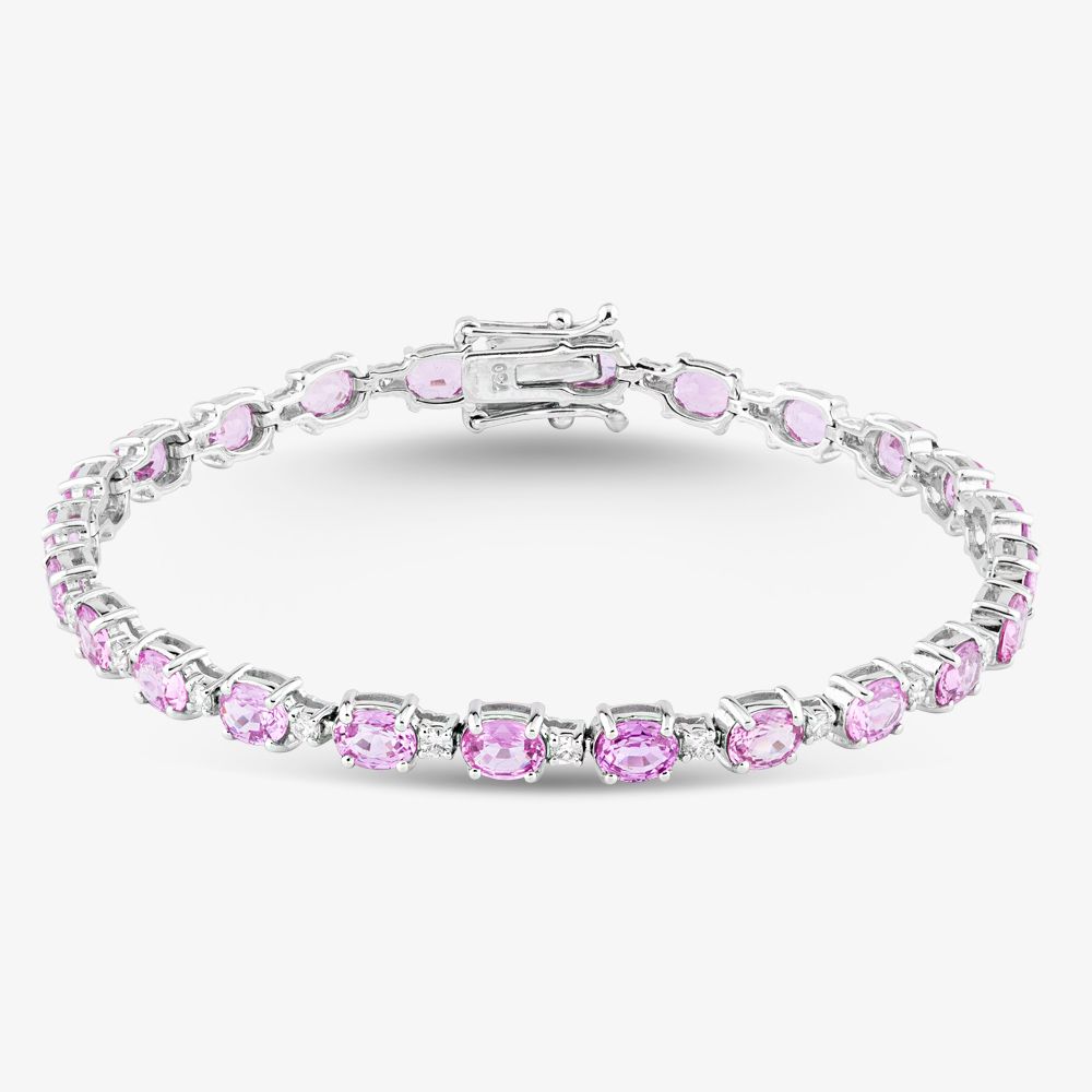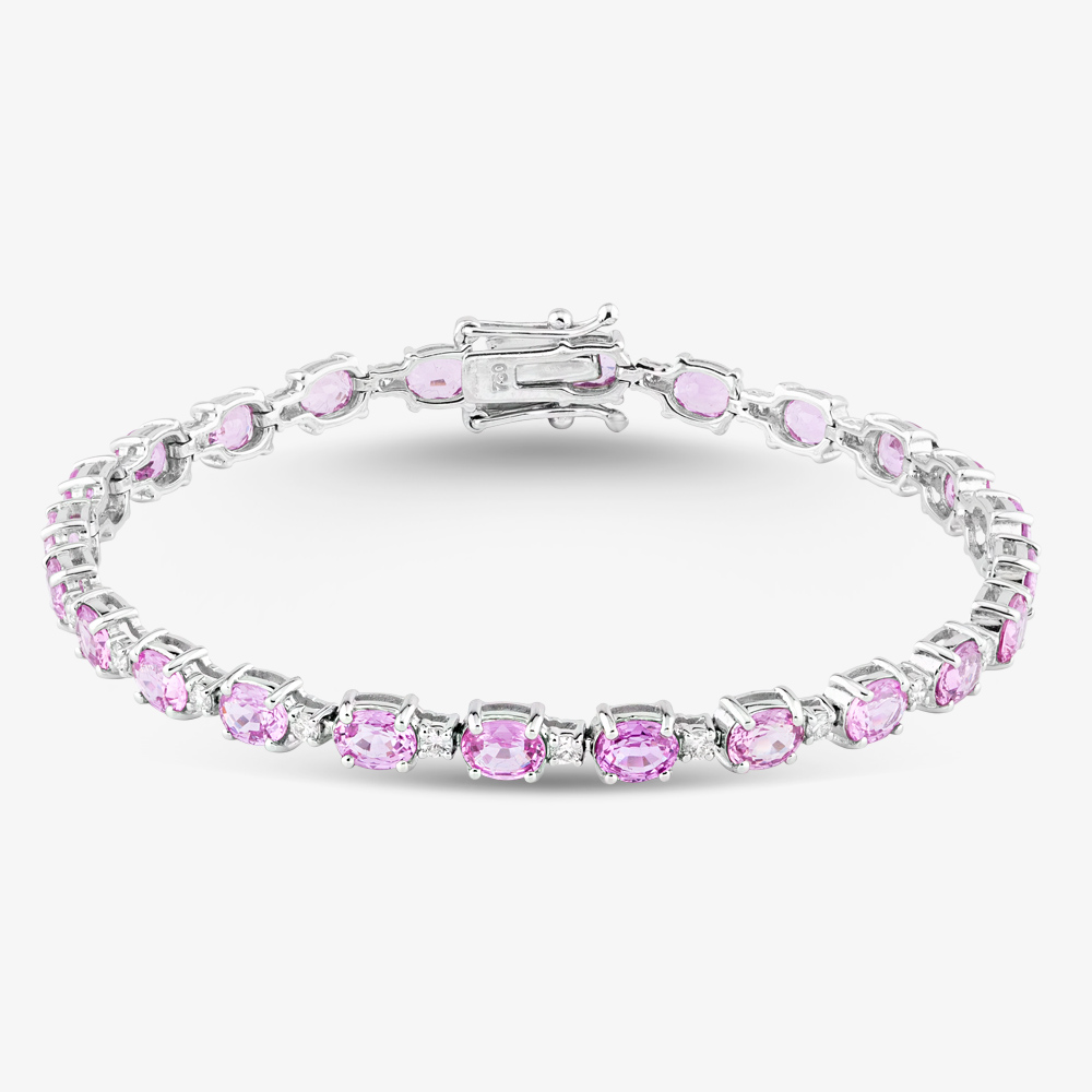 This 18ct White Gold Tennis Bracelet measuring 7 inches features stunning 9.58ct oval cut sapphires surrounded by 0.59ct brilliant cut diamonds.The vibrant pink sapphires instantly catch the eye, designed for those who appreciate true luxury, this bracelet promises both aesthetic beauty and lasting quality.