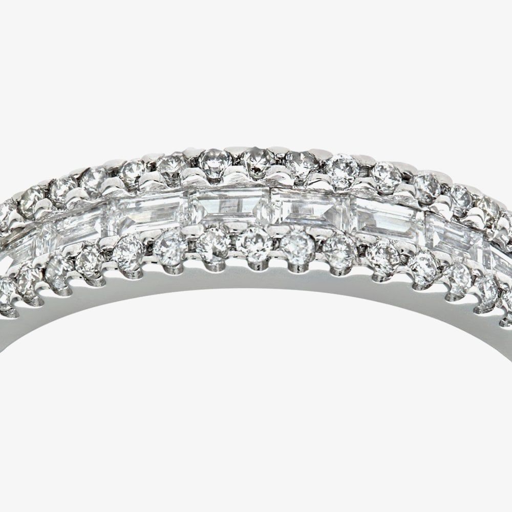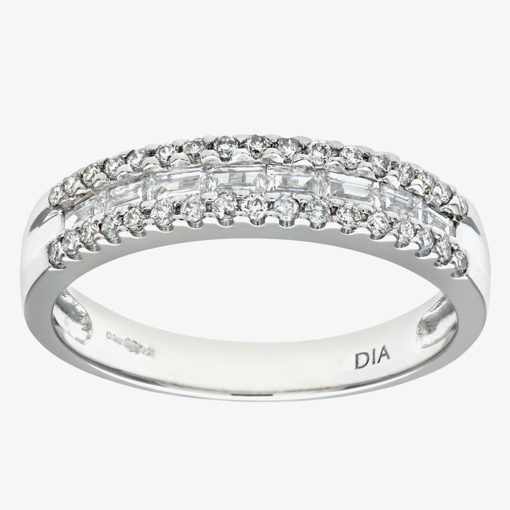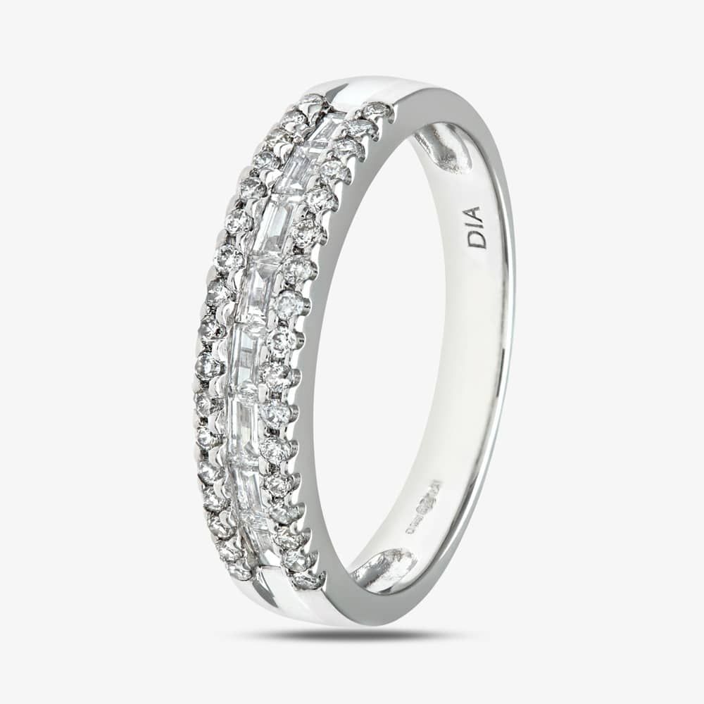 This modern half eternity ring is crafted in 18ct white gold & features diamonds in a three-row design with a central baguette cut row with a brilliant cut row of diamonds either side which have a total carat weight of 0.58ct. This ring is a perfect stand-alone piece or ideal for layering & combining with other rings to create your own unique look.