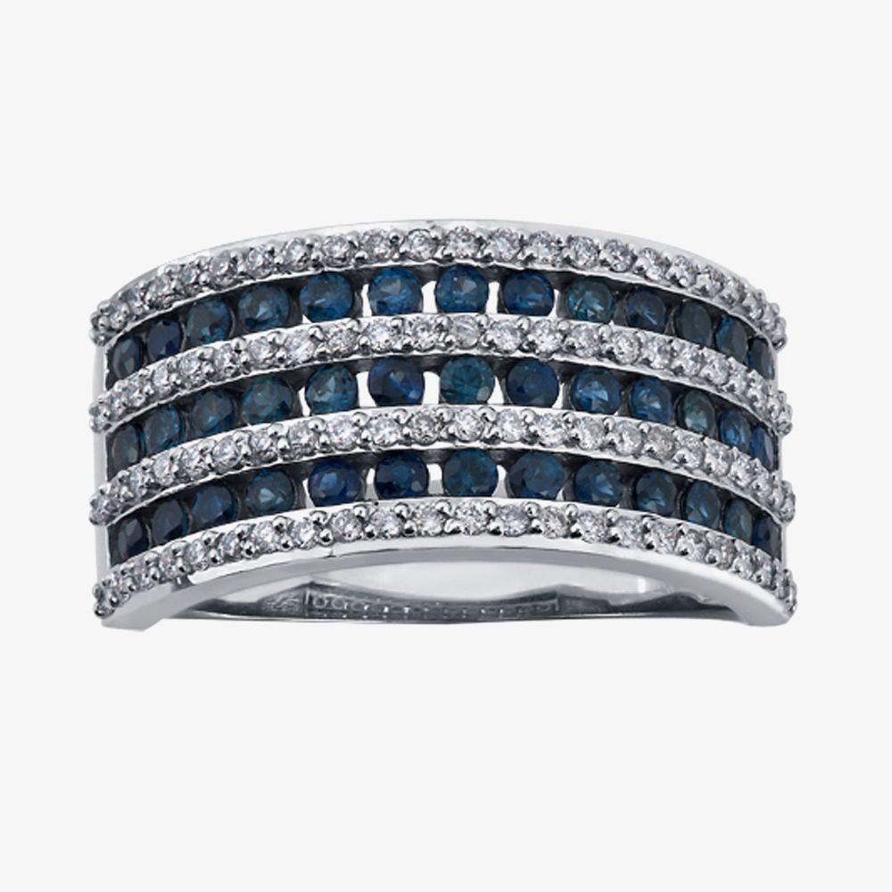 Give a stunning gift to someone special with this dazzling seven row ring, crafted from luxurious 18ct white gold in a gorgeous alternating gemstone design. Featuring four rows of twinkling diamonds with an impressive total weight of 0.30ct, alternating between three rows of sparkly deep blue topaz. Bring this glamorous ring to your outfits for an eye catching shimmer on your ring finger, buy with confidence.