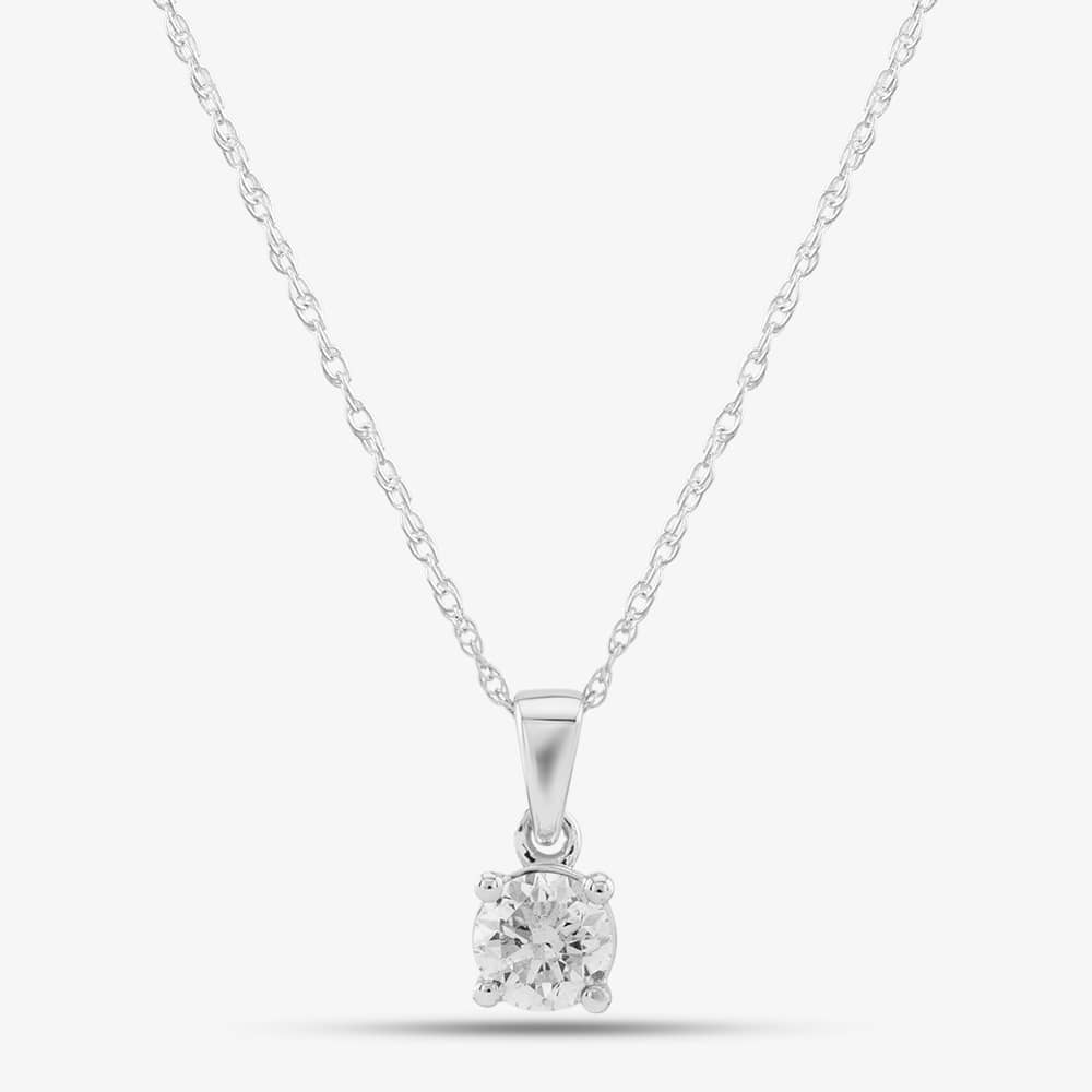This elegant pendant necklace features a brilliant-cut white diamond set in a classic four-claw setting. The diamond is suspended from an 18-inch Prince of Wales chain, crafted from 18ct white gold. The diamond has a clarity of I1 and a colour grade of H, ensuring a beautiful sparkle and a timeless appeal.