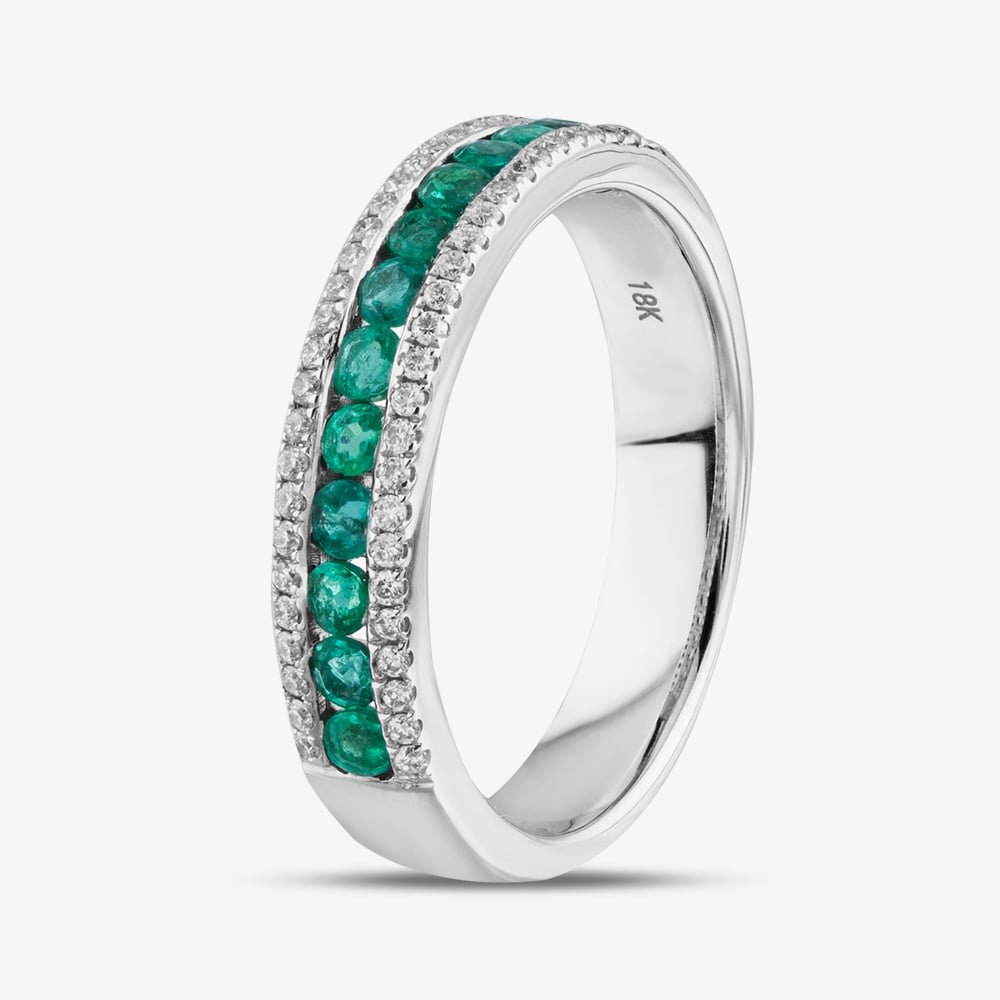 A dazzling 18ct white gold half eternity ring featuring three rows of alternating brilliant-cut emeralds and diamonds. This exquisite design combines vibrant green hues with sparkling brilliance, offering a timeless and elegant piece perfect for marking special moments.