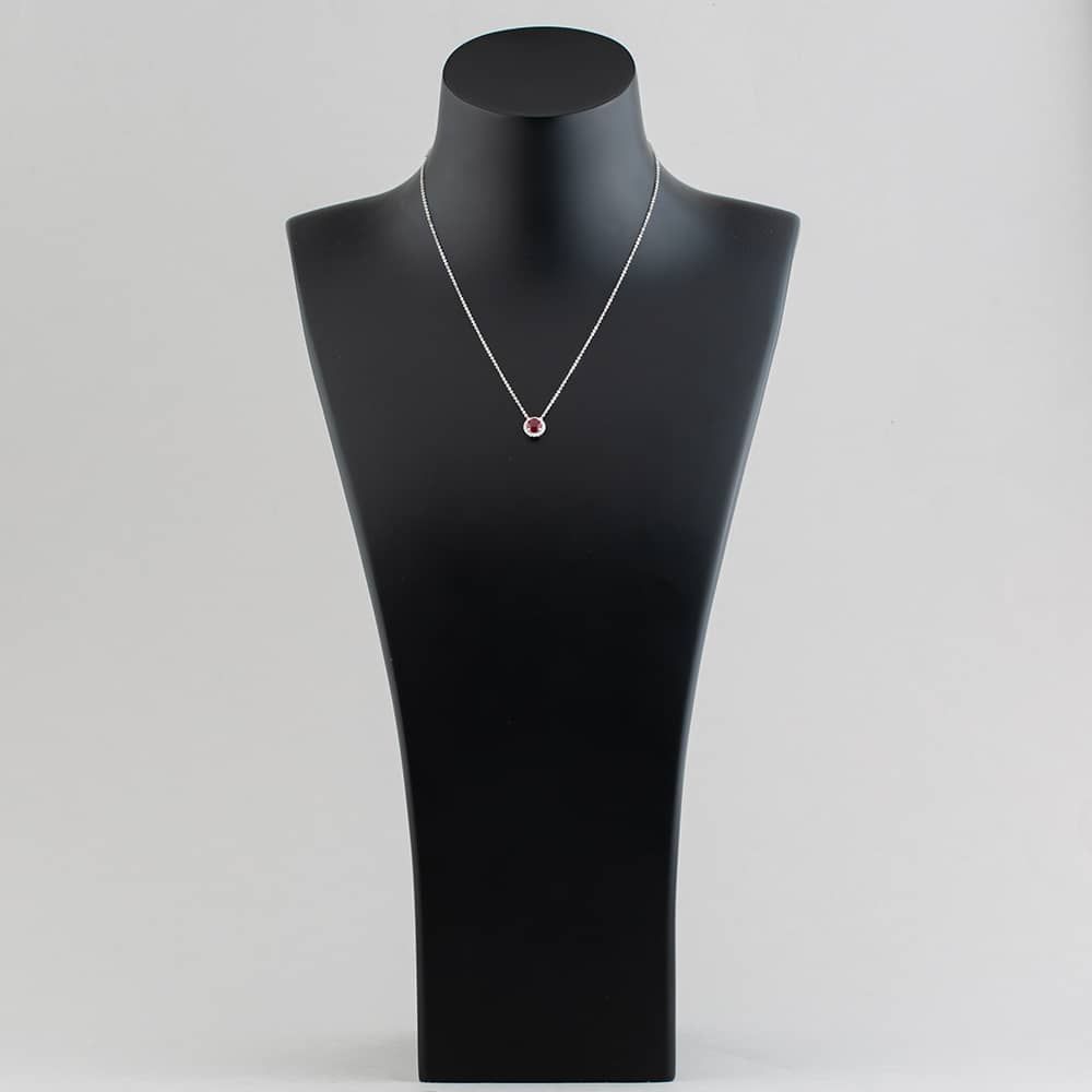 Embrace the timeless beauty of this ruby halo necklet. Crafted from 18ct white gold, it showcases a round ruby centre stone, accentuated with a brilliant-cut white diamond halo, suspended on a 39cm trace chain, securely fastened with a lobster claw clasp. This necklace is perfect for everyday wear or adding a touch of sophistication to a special occasion.