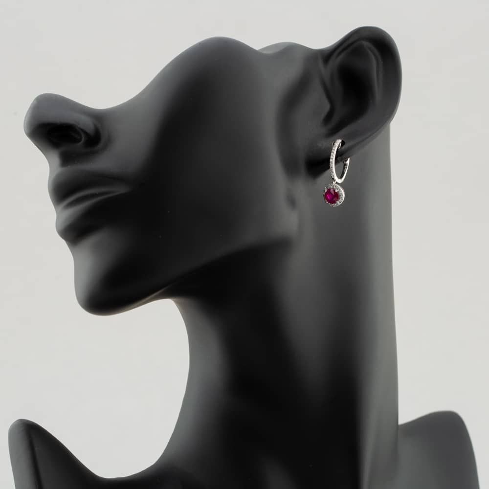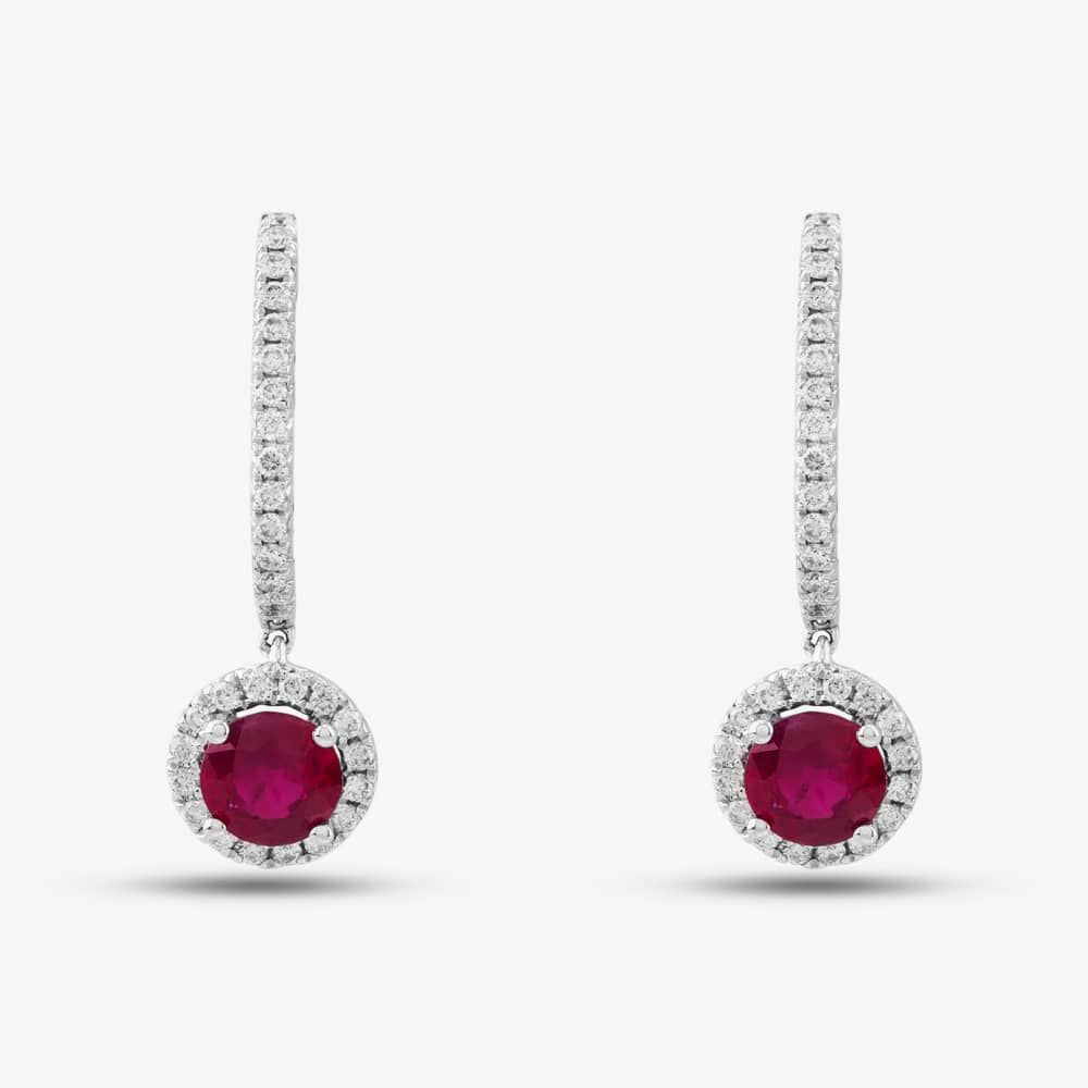 Each hoop is adorned with brilliant-cut white diamonds, meticulously set to shimmer and sparkle with every movement. Suspended from each hoop is a captivating ruby dropper, surrounded by a halo of brilliant-cut diamonds, enhancing their allure and creating a dazzling display of light and colour.