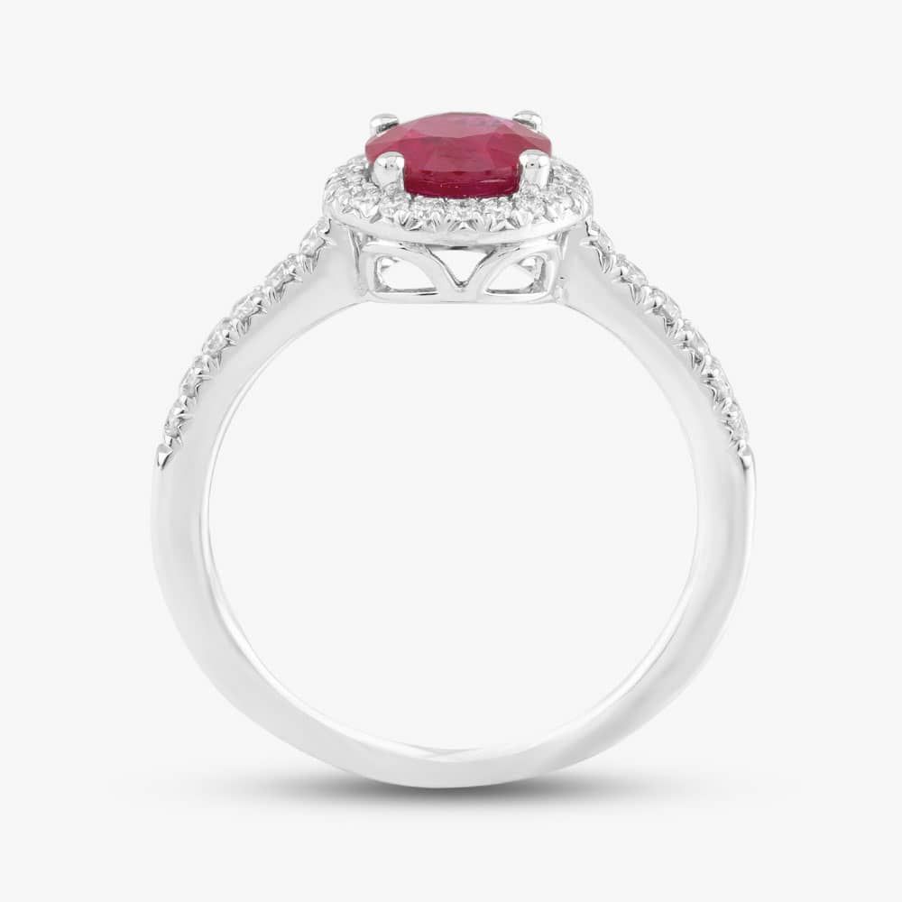 Adorn your hand with exquisite elegance with this ring, it features a radiant ruby at its centre, embraced by a halo of brilliant-cut diamonds, lending it a timeless allure. The shoulders of the ring are adorned with shimmering diamonds, enhancing its luxurious appeal.