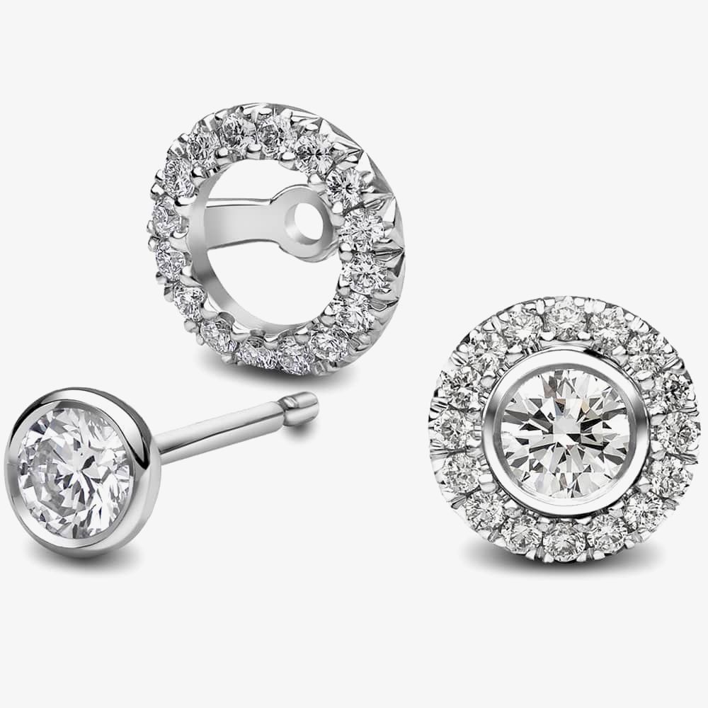 A striking pair of 18ct white gold stud earrings crafted with a round rubover set diamond centre stone along with a diamond halo surround which catches the light and sparkles beautifully. These versatile earrings can be worn as a cluster earring or as a single stone stud earring dependent on outfit, occasion or mood!