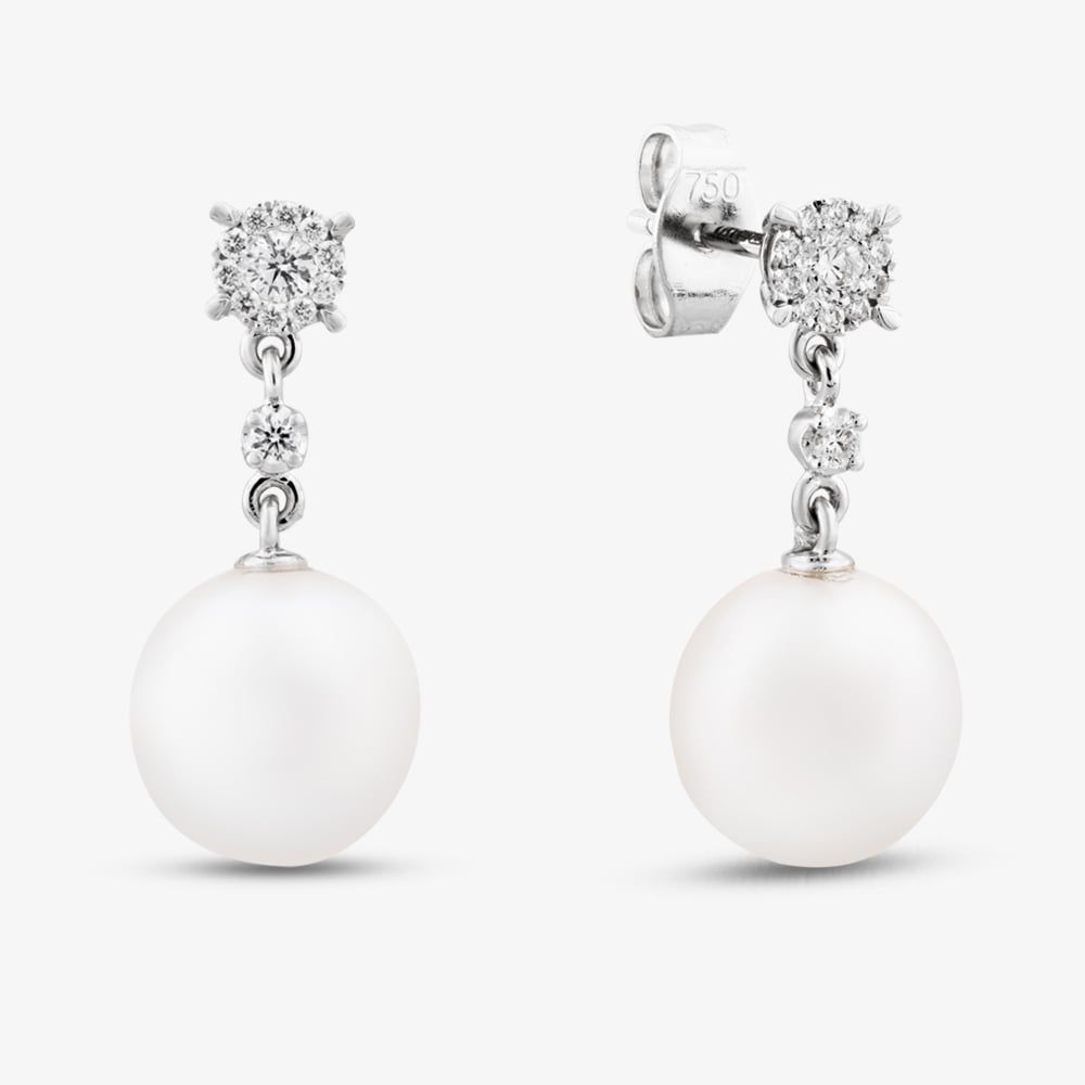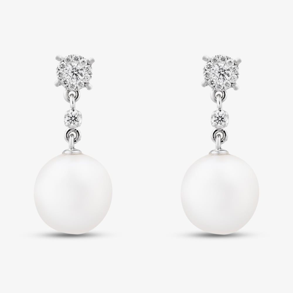 Elevate your evening outfits with these luxurious diamond and freshwater pearl earrings. Crafted from fine 18ct white gold these timeless earrings feature a round-cut diamond cluster stud with a smaller single diamond hanging below for additional sparkle. Complete with a lustrous freshwater pearl at the bottom of each drop and secured with a post and butterfly fastening, these earrings are perfect for gifting to someone special to mark a celebration, anniversary or simply just because.
