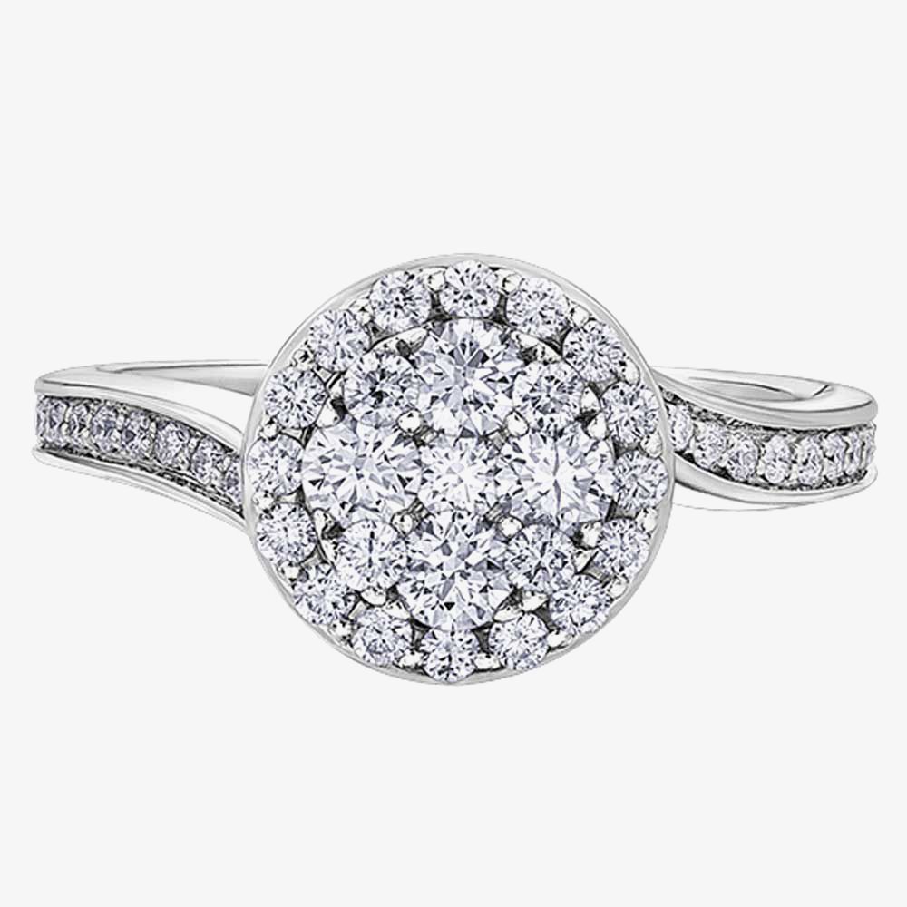 A shimmering sixteen diamond halo is added for extra sparkle, and twenty two diamonds are set into the shoulders for a finishing touch.