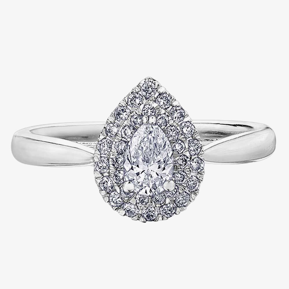 The beautiful 0.32ct pear-cut diamond occupying the centrepiece of this ring is supplemented by forty nine smaller round brilliant diamonds, set into the twin halos and into the mount.