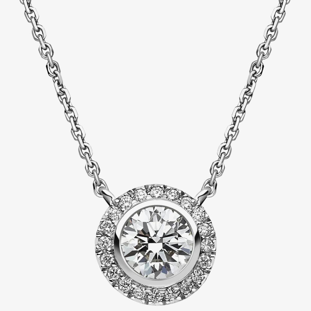 A striking 18ct white gold necklace crafted with a round rubover set diamond centre stone along with a diamond halo surround which catches the light and sparkles beautifully.