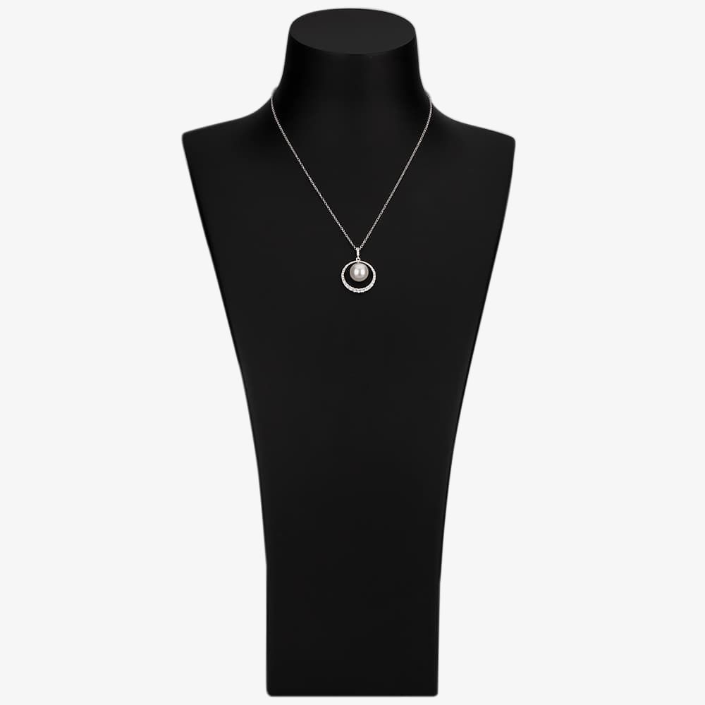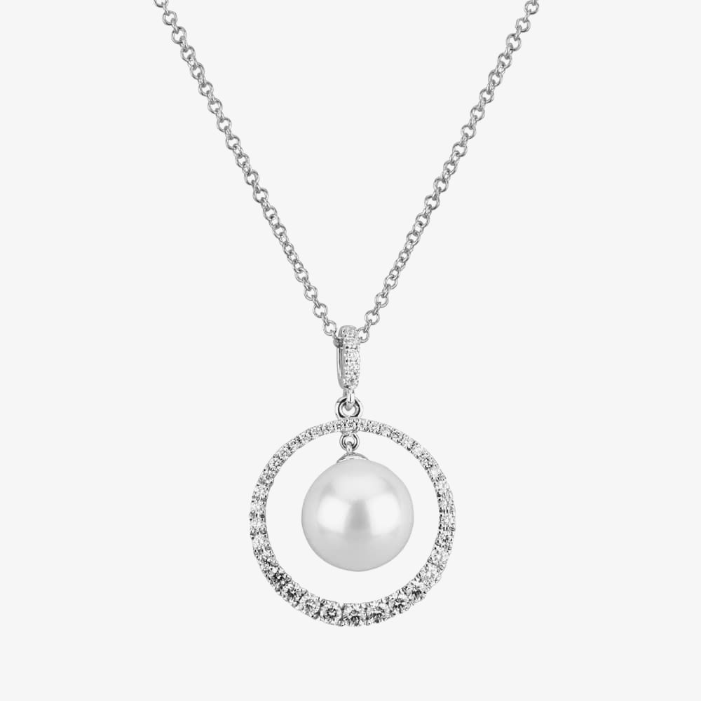 Crafted in 18ct white gold, this stunning pendant features an open circle design adorned with sparkling diamonds. The circle pendant also features a freshwater pearl dropper suspended from a diamond encrusted bale fastening. The pendant sits upon a delicate curb chain that is finished with a lobster clasp fastening.
