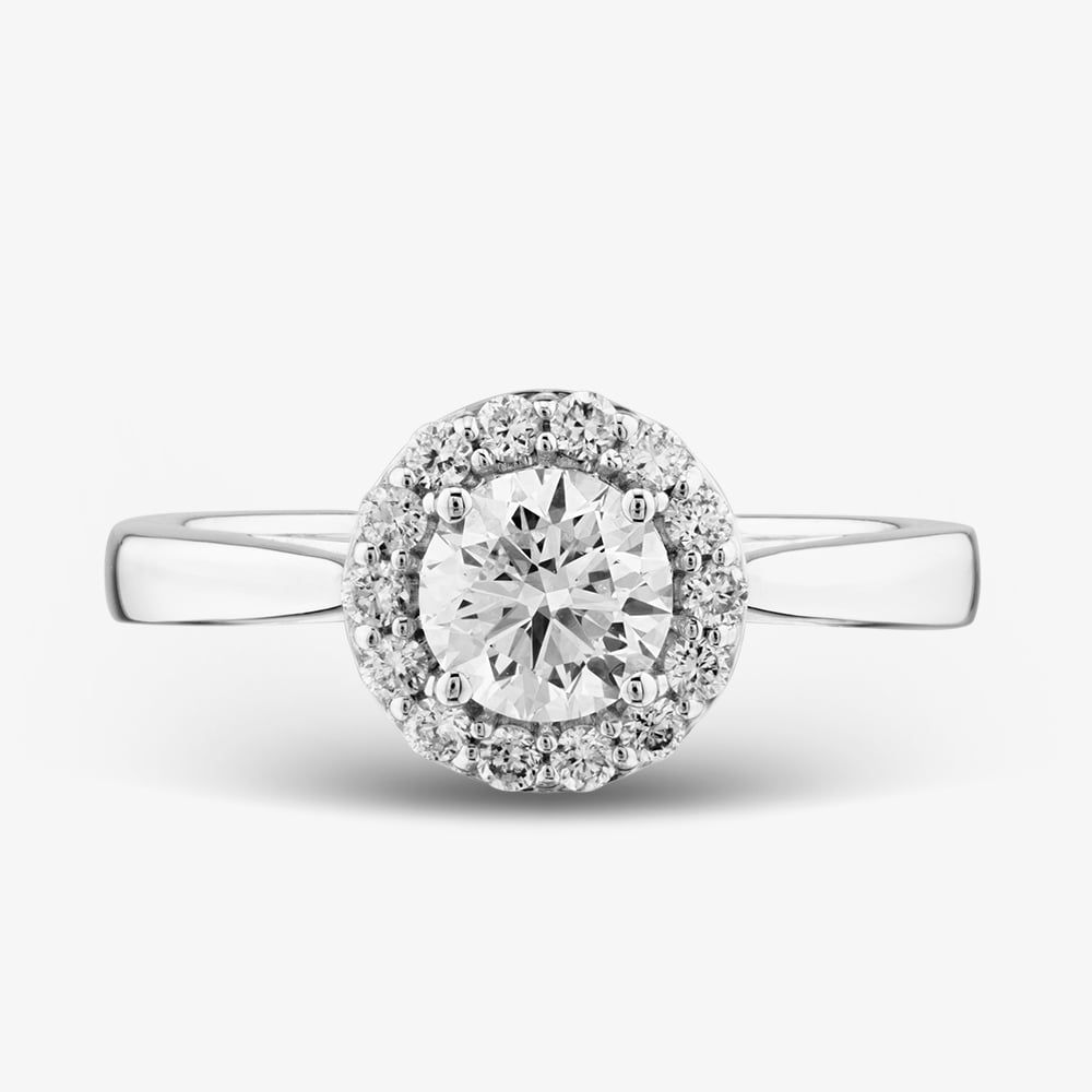 Radiating timeless elegance, this lab grown diamond halo ring is beautifully crafted in 18ct white gold. At its heart lies a stunning single brilliant-cut centre stone, held in a classic four-claw setting. Encircling it, 14 finely set round lab grown diamonds create a luminous halo, enhancing its brilliance and adding dimension to this breathtaking design.