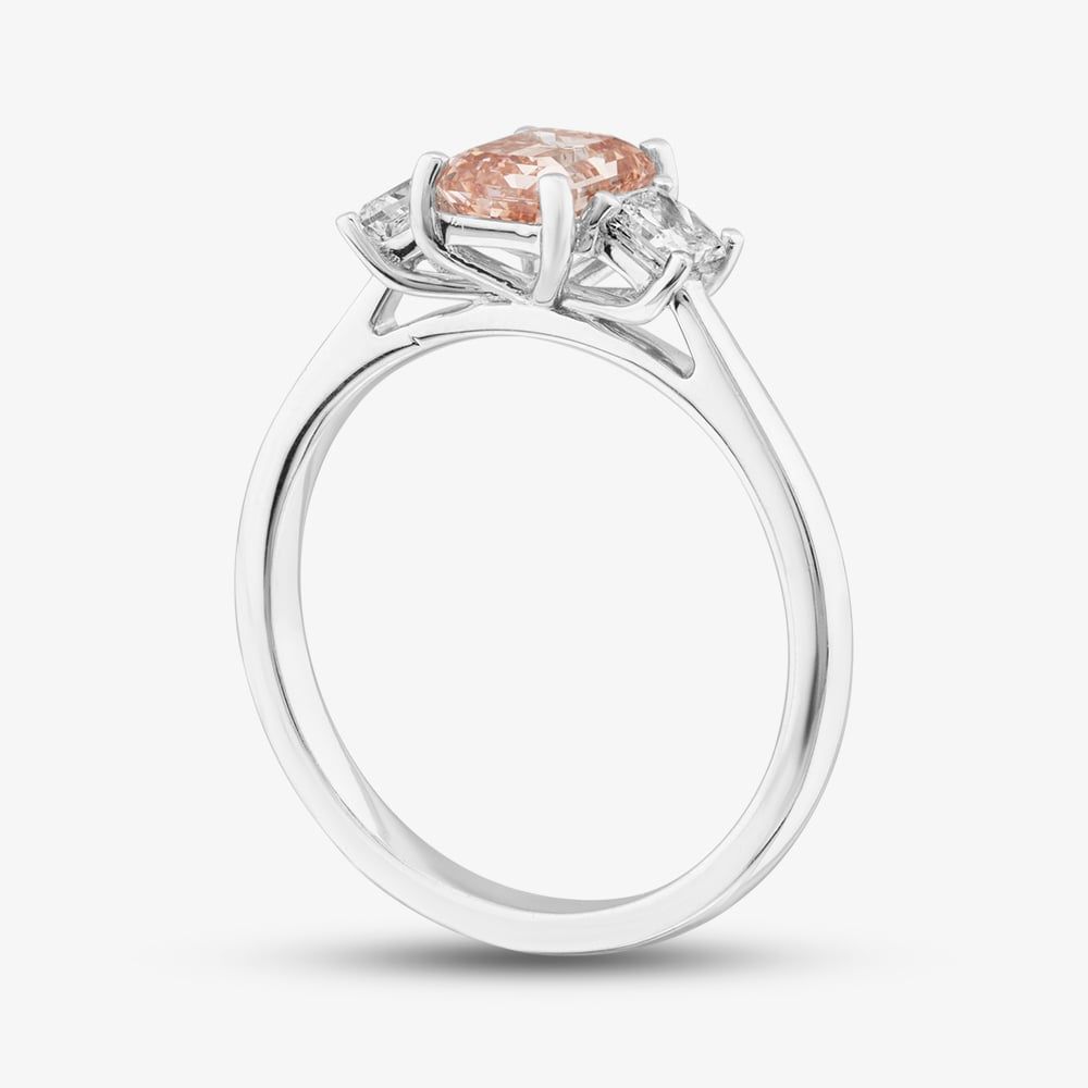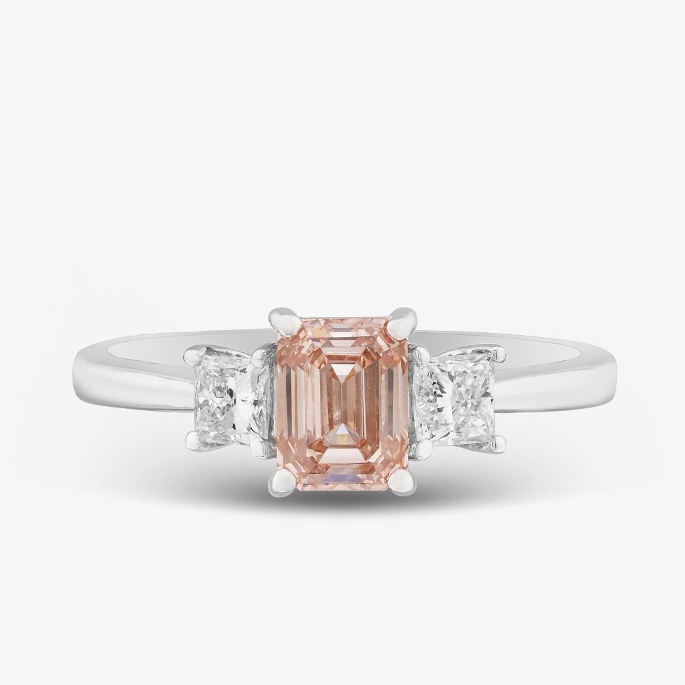 A striking fusion of elegance and individuality, this trilogy ring is beautifully crafted in 18ct white gold. At its centre, a captivating pink baguette cut lab grown diamond takes the spotlight. Framed by two princess cut white lab grown diamonds that enhance its unique charm and brilliance, all of which are securely placed with a four-claw fitting. The trilogy design symbolises the past, present, and future, making this piece a meaningful expression of enduring love and refined style.