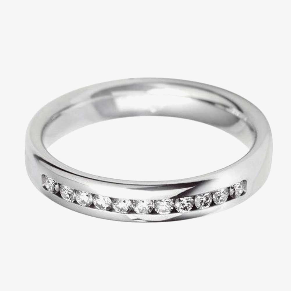A beautiful ladies wedding band, expertly crafted in 18ct white gold to give a luxurious finish. The stylish court shaped band features a host of stunning diamonds in an attractive channel set design. The sparkly stones have been brilliant cut with a colour H and clarity SI to give a radiant shine to any ring finger.
