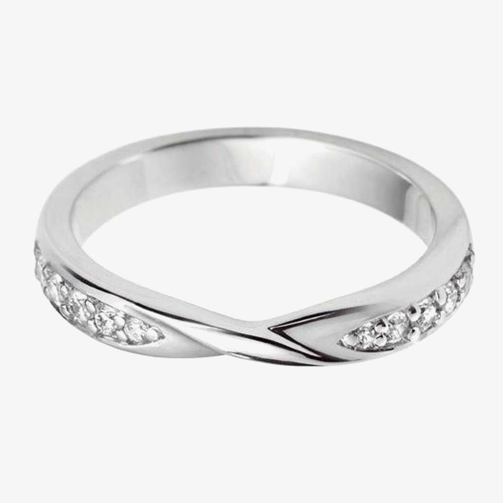 A beautifully stylish ladies wedding ring crafted from luxurious 18ct white gold, producing a top quality finish that shines brilliantly. The elegant 2.8mm band features an attractive twist design adorned with dazzling diamonds. These radiant brilliant cut stones have a colour H and clarity SI, with a weight of 0.15ct.