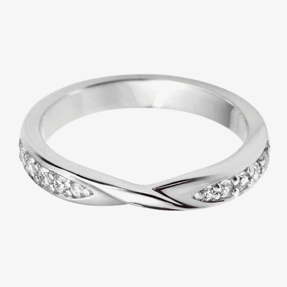 A beautifully stylish ladies wedding ring crafted from luxurious 18ct white gold, producing a top quality finish that shines brilliantly. The elegant 3.3mm band features an attractive twist design adorned with dazzling diamonds. These radiant brilliant cut stones have a colour H and clarity SI, with a weight of 0.17ct.