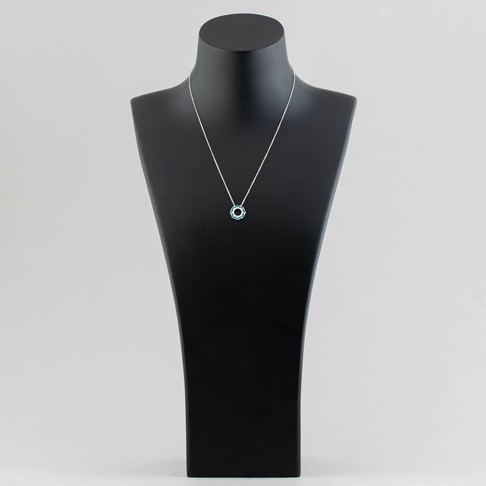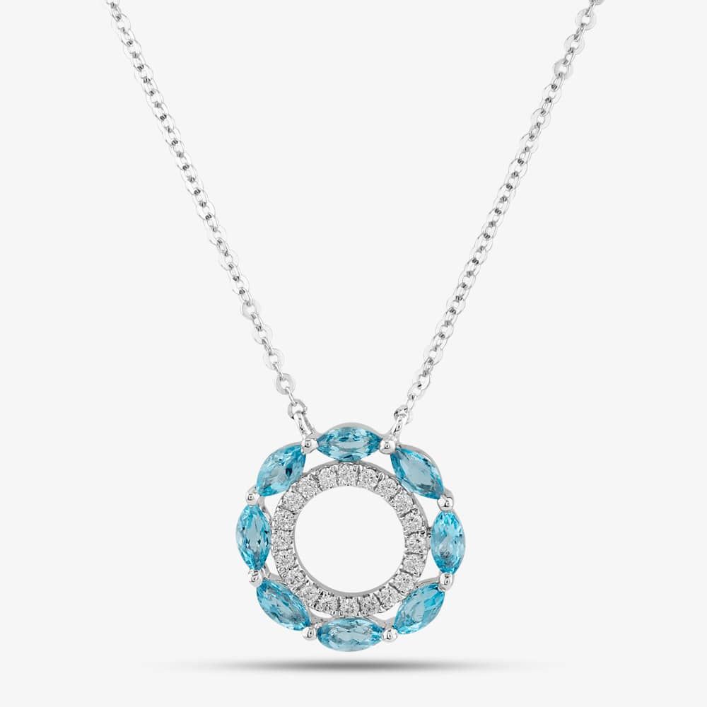 This 18ct white gold circular pendant features marquise-cut blue topaz and brilliant-cut diamonds that create a sparkling open-circle design. The combination of cuts and shapes gives the piece extra brilliance and visual interest. Suspended on an adjustable trace train and securely fastened with a lobster claw clasp, this dazzling pendant makes an elegant statement piece.
