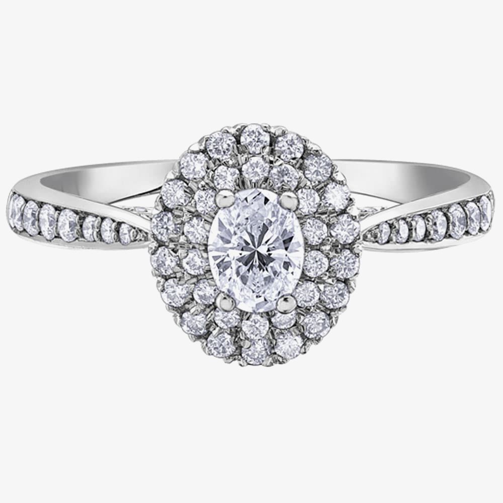 The opulent 0.30ct oval diamond occupying the centrepiece of this ring is supplemented by forty eight smaller diamonds, set into the twin halos and into the mount.