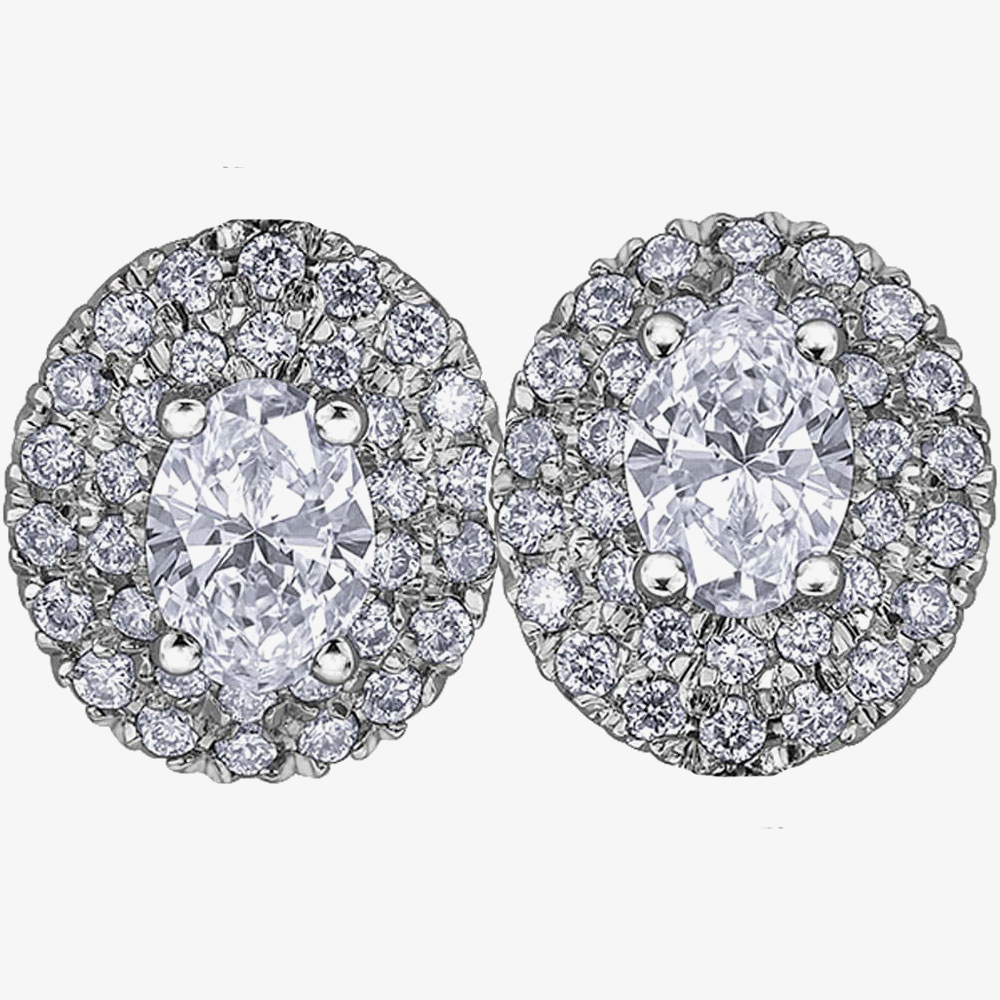 Thirty two small round brilliant stones are used to create a double halo around the 0.20ct four claw-set oval-cut diamond in each of these stud earrings.