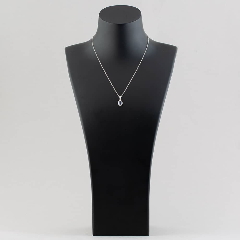 Embrace the timeless beauty of this sapphire halo necklace. Crafted from 18ct white gold, it showcases an oval-cut sapphire centre stone, accentuated with a brilliant-cut white diamond halo, suspended on an adjustable trace chain, securely fastened with a lobster claw clasp. This necklace is perfect for everyday wear or adding a touch of sophistication to a special occasion.