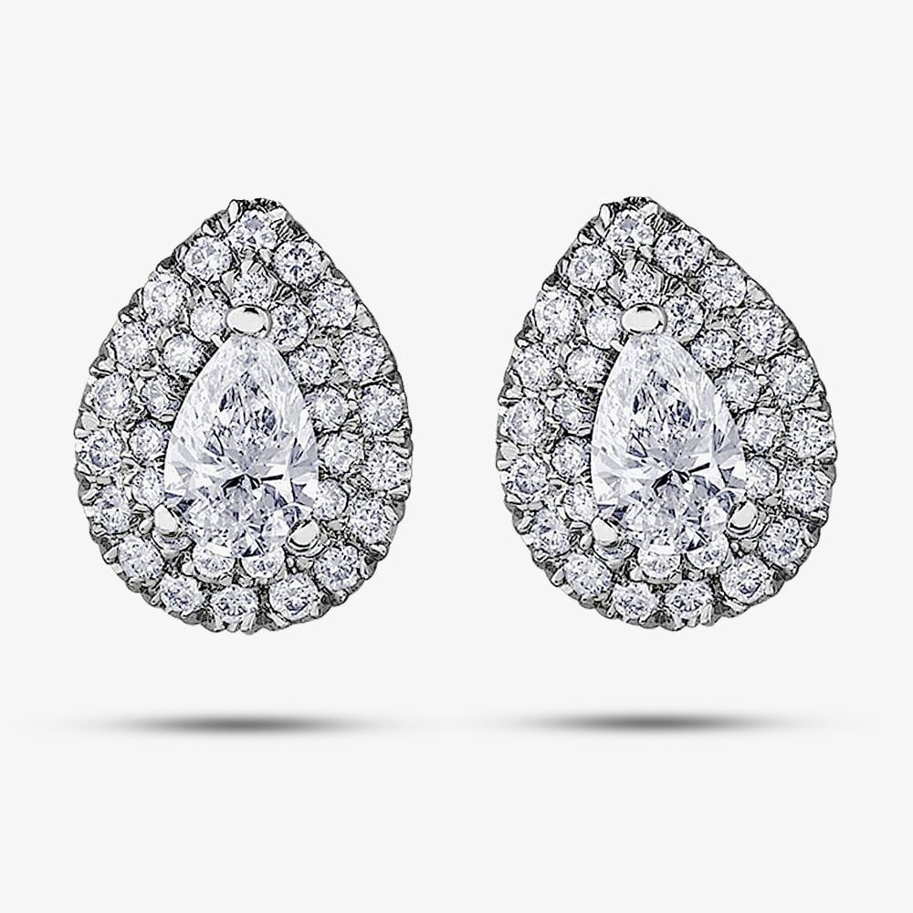 Thirty three small round brilliant stones are used to create a double halo around the 0.20ct martini-set pear-cut diamond in each of these stud earrings.