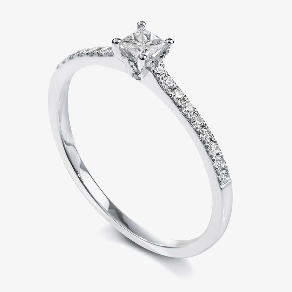 A stunning diamond single stone ring sure to bring a radiant sparkle to any ring finger. Expertly crafted from luxurious 18ct white gold, featuring a wonderful 0.20ct princess cut centre in a stylish four claw setting, that allows for maximum light refraction and sparkle. Complete with round brilliant cut diamond shoulders for an extra dazzling finish, buy with confidence.