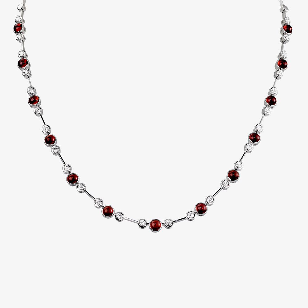 A stunning jewellery box addition that will bring unique sparkle, colour and classic elegance to any occasion or outfit, the 18ct White Gold Ruby and Diamond Necklet HSN1028(DIA/RU)S is a must-have. Made from 18ct white gold, this dainty necklet features 0.90ct of round brilliant-cut diamonds and multiple 4.1mm wide ruby stoned in spaced rubover settings to give glamour to anyone who wears them.