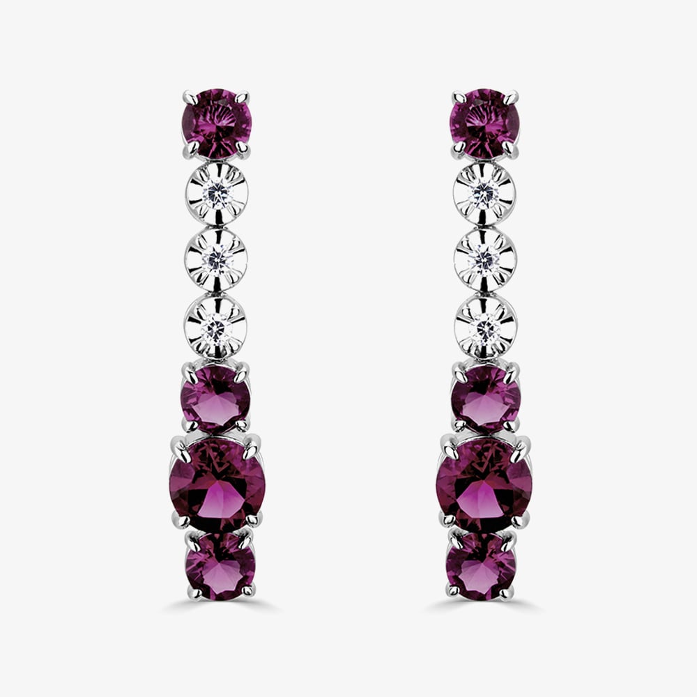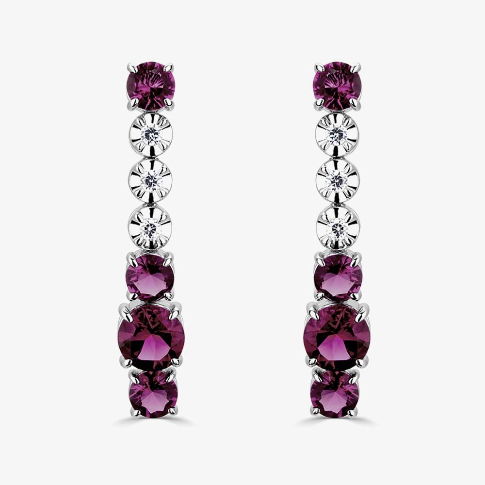 These sophisticated dropper earrings are crafted in 18ct white gold & feature 1.40ct of claw set round red rubies & 0.05ct of illusion set brilliant cut diamonds which catch the light beautifully. A contemporary & stylish pair of earrings to add a touch of sparkle to any outfit.
