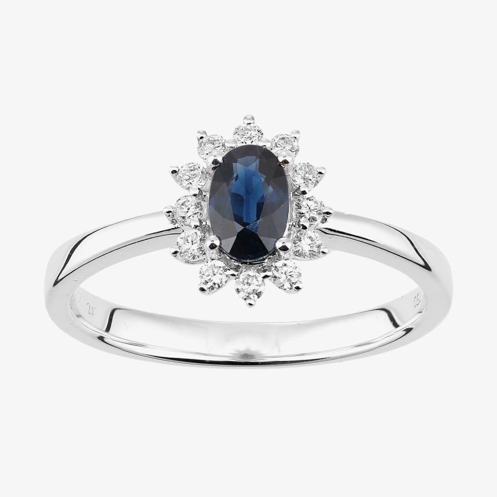 This attractive cluster ring is crafted in 18ct white gold & features an oval sapphire centre stone with a sparkling diamond surround which have a total carat weight of 0.15ct. This ring is a perfect stand-alone piece or ideal for layering & combining with other rings to create your own unique look.