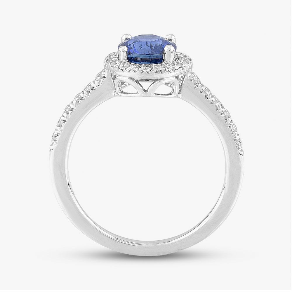 Crafted with a touch of simplicity, this shoulder-set halo ring exudes timeless elegance. Delicate 18ct white gold embraces a sparkling round-cut sapphire centre stone, adorned with a halo of brilliant-cut white diamonds enhancing the centre stone, while the shoulders glisten with their diamond-encrusted brilliance. Each stone, nestled in a classic four-claw setting, promises to sparkle with every movement, making this ring a timeless symbol of subtle luxury.
