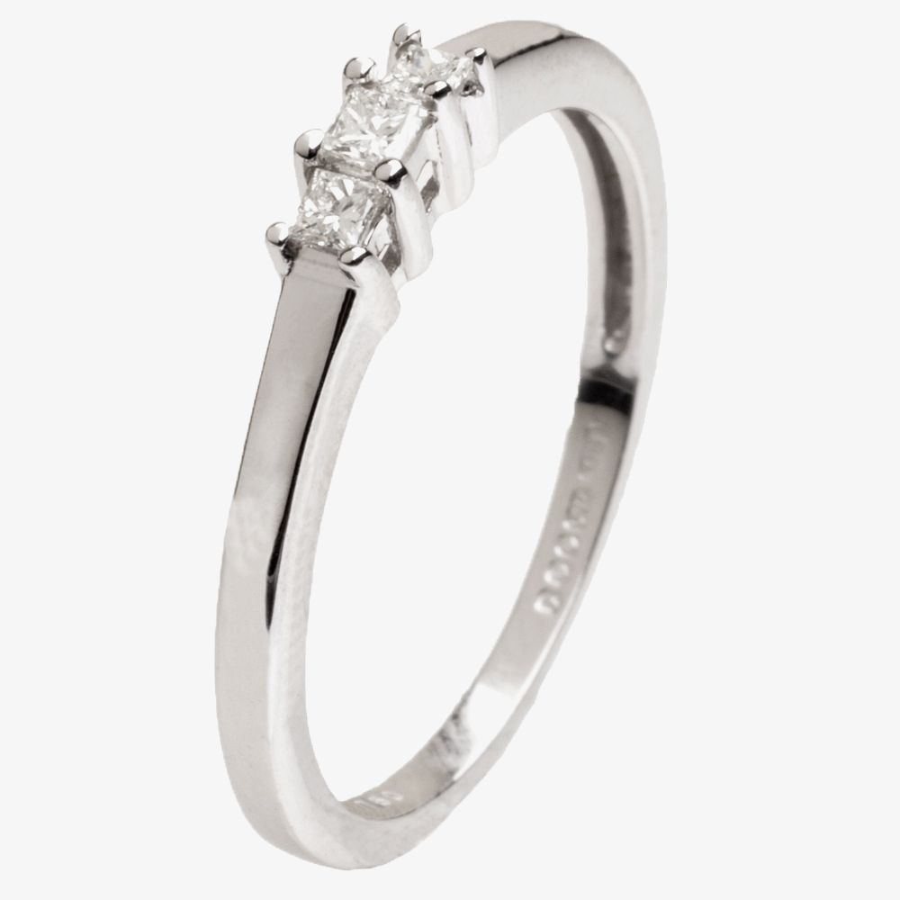 A subtle 18 carat white gold trilogy ring set with three graduated princess cut diamond stones. Perfect for stacking with other rings, or wearing solo. Add shine and sparkle to your hand with this elegant piece.