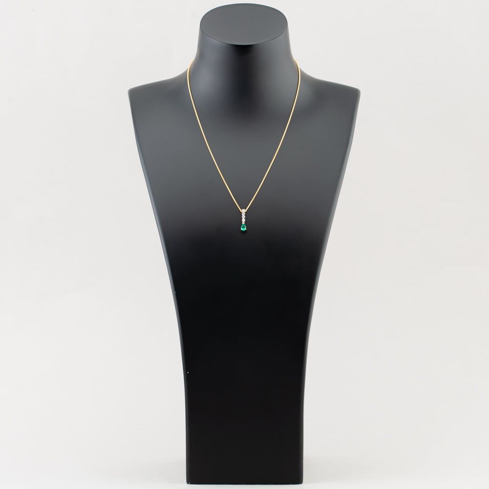 This stunning necklace showcases an 18ct yellow gold curb chain, adorned with a 0.40ct pear-cut emerald pendant. The vivid emerald is beautifully accented by four brilliant-cut white diamonds, totalling 0.15ct, set in elegant 18ct white gold. A harmonious blend of colour and brilliance, this piece exudes timeless charm and sophistication.