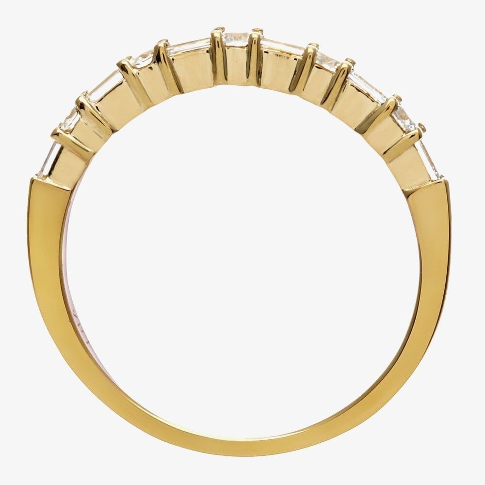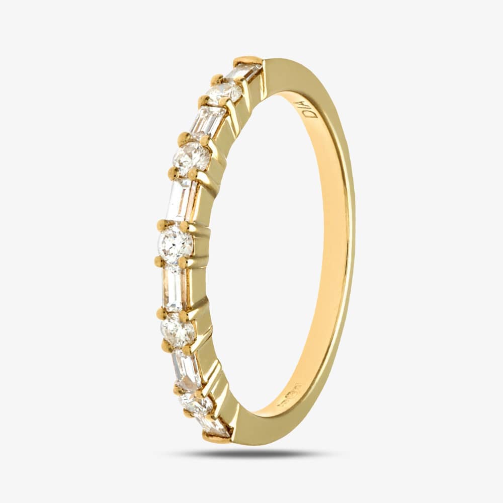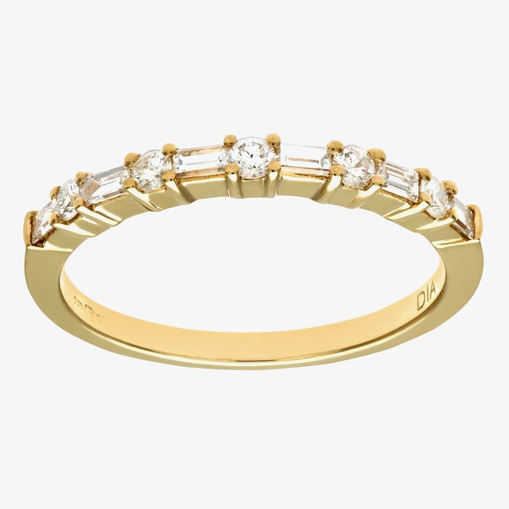 This modern half eternity ring is crafted in 18ct yellow gold & features alternating baguette & brilliant cut diamonds which have a total carat weight of 0.45ct. This ring is a perfect stand-alone piece or ideal for layering & combining with other rings to create your own unique look.