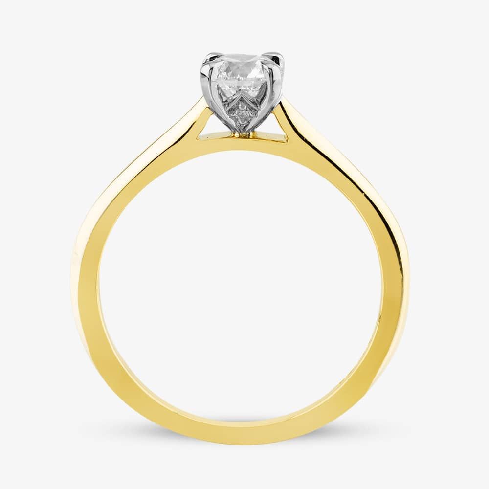 This stunning masterpiece of jewellery craftsmanship is a must-have. Exquisitely crafted from the finest 18ct yellow gold, this delicate solitaire ring is adorned with an SI1 clarity, certified 0.70ct brilliant-cut white diamond with a graded colour of D. The diamond is set in a platinum basket four-claw setting, enhancing its brilliance. Two additional small diamonds add a touch of extra sparkle to the basket setting, making this ring a true showstopper.