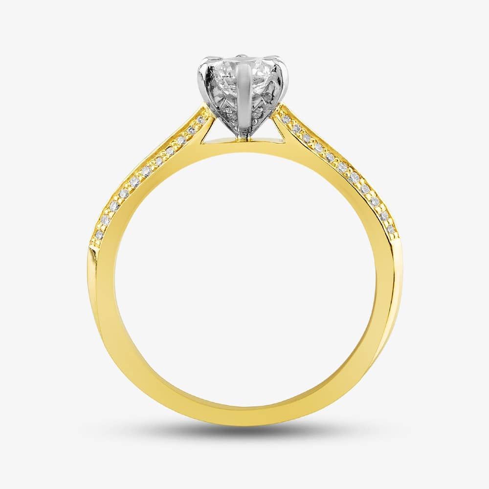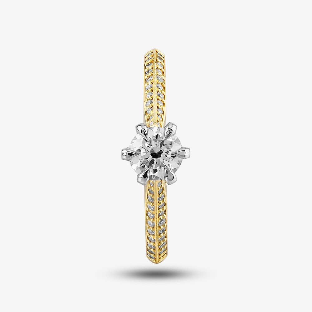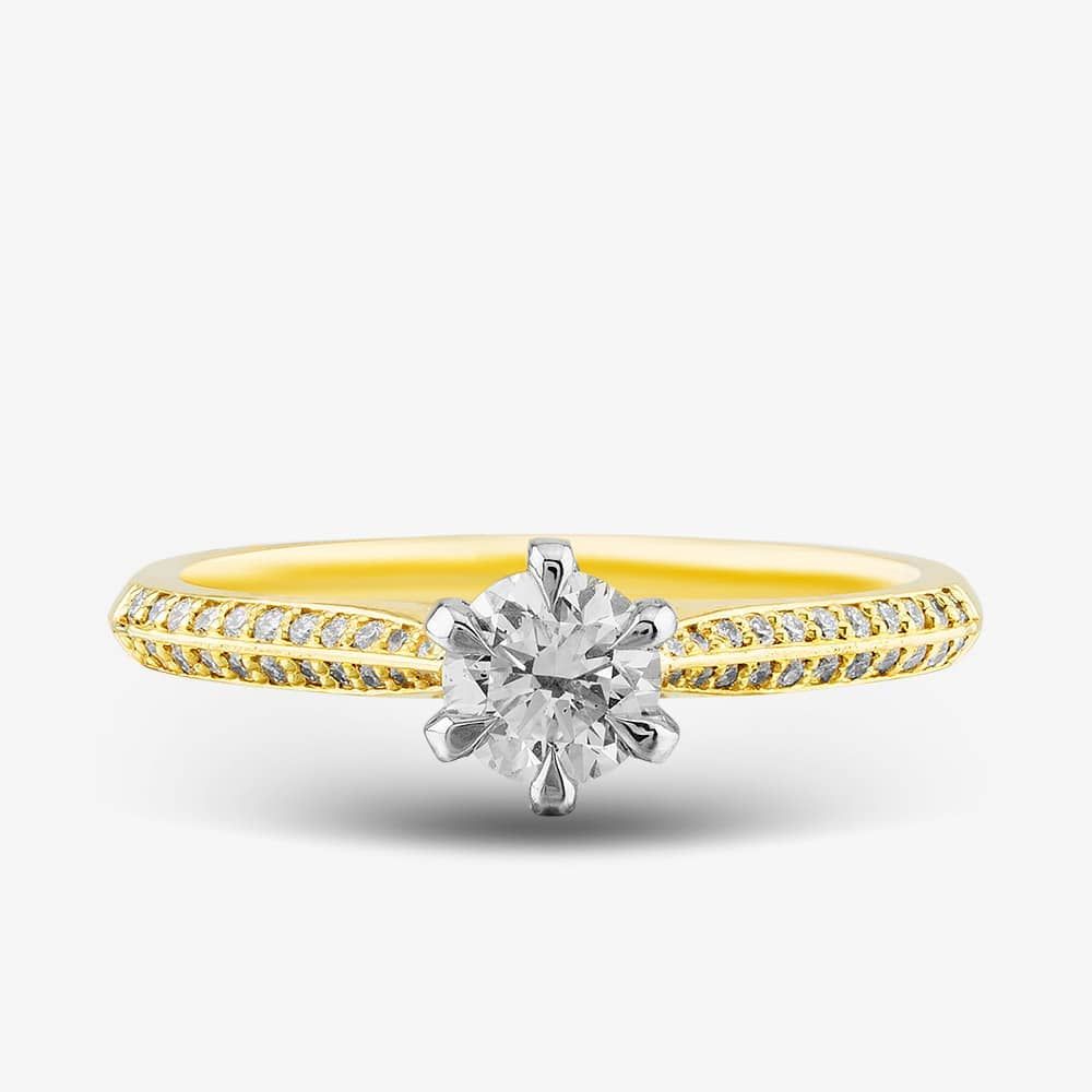 This stunning masterpiece of jewellery craftsmanship is a must-have. Exquisitely crafted from the finest 18ct yellow gold, this delicate shoulder set solitaire ring is adorned with an SI1 clarity, certified 0.50ct brilliant-cut white centre diamond with a graded colour of D. The diamond is set in a basket six-claw setting, enhancing its brilliance. Four additional small diamonds add a touch of extra sparkle to the basket setting. The centre diamond is accentuated by two rows of 0.17ct brilliant-cut white diamond shoulders, set in a classic four-claw setting. With a total carat weight of 0.67ct.