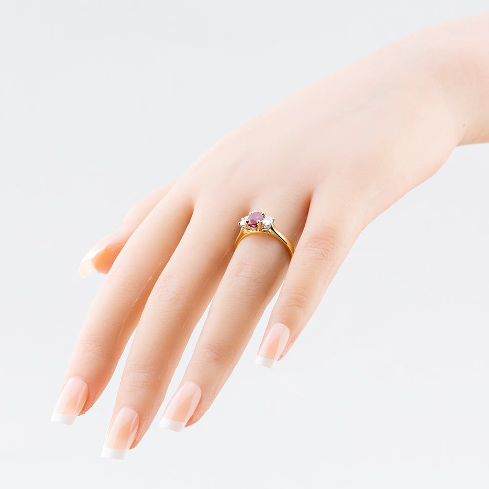 This beautiful 18ct yellow gold shoulder set solitaire ring features a striking 0.80ct oval ruby at its centre. The rich, vibrant red of the ruby is elegantly framed by two 0.37ct round brilliant-cut diamonds on either side, adding a stunning contrast and sparkle to the design. The warm yellow gold band enhances the vivid colour of the ruby and the dazzling brilliance of the diamonds, creating a timeless and luxurious piece that exudes both elegance and sophistication. Perfect for special occasions or as a unique statement of love.