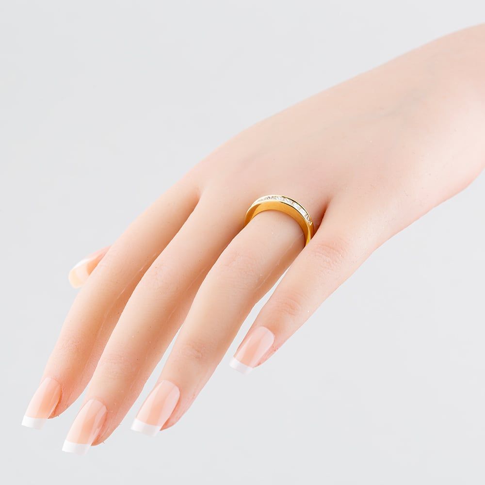 A refined 18ct yellow gold half eternity ring featuring princess-cut diamonds with a total weight of 1.01ct. The sleek design showcases the brilliance of the diamonds, offering a sophisticated and timeless piece.