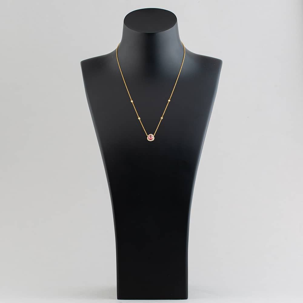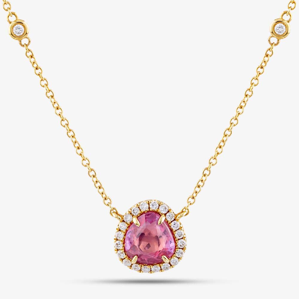 Embrace the timeless beauty of this pink sapphire halo necklace. Crafted from 18ct yellow gold, it showcases a 1.06ct pink sapphire centre stone, accentuated with a 0.22ct brilliant-cut white diamond halo, suspended on a 44cm trace chain. This necklace is perfect for everyday wear or adding a touch of sophistication to a special occasion.