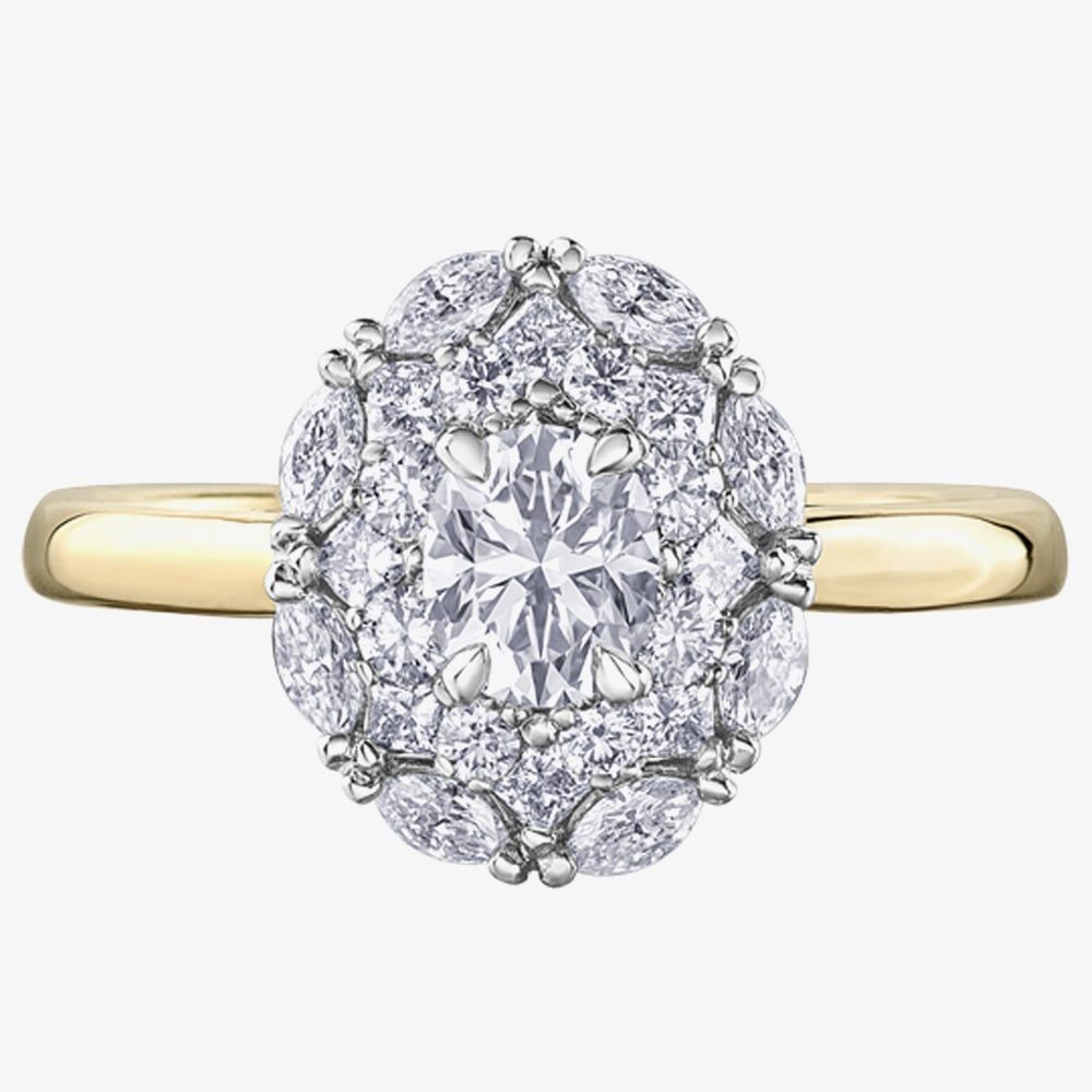 An eye-catching diamond cluster ring which is created in 18ct yellow gold & features an oval cut centre stone with a round, square & marquise cut surround which altogether catches the light beautifully. Ideal as a stand-alone piece or perfect for layering or stacking with other rings to create your own unique look. Centre Stone 0.50ct.