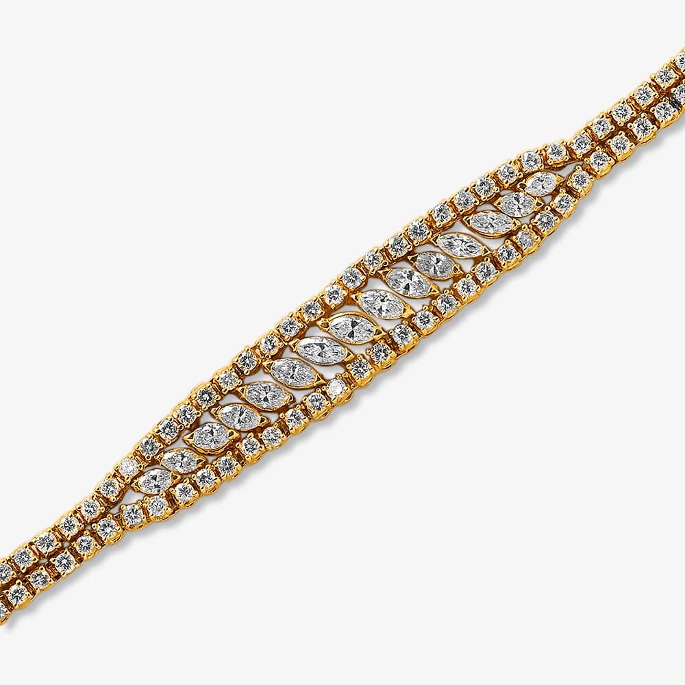 This exquisite tennis bracelet is a must-have for any jewellery collection. Delicately crafted from 18ct yellow gold, it is set with 6.50ct of white brilliant cut and marquise cut diamonds with a graduated design. The diamonds sparkle and shine, making this bracelet a truly eye-catching piece of jewellery. The graduated design adds a touch of sophistication, making this bracelet the perfect finishing touch to any outfit. Whether you are dressing up for a special occasion or simply want to add a touch of glamour to your everyday look, this 18.5cm tennis bracelet is sure to turn heads.