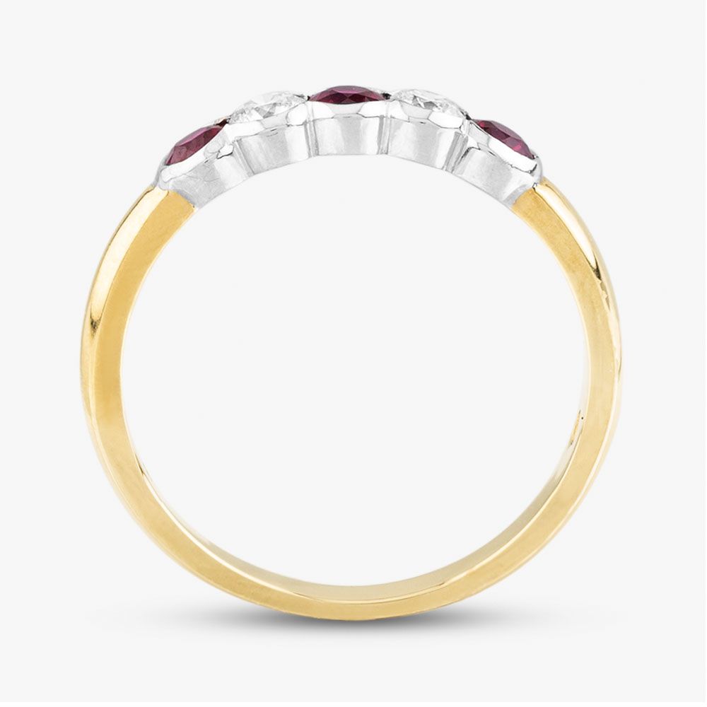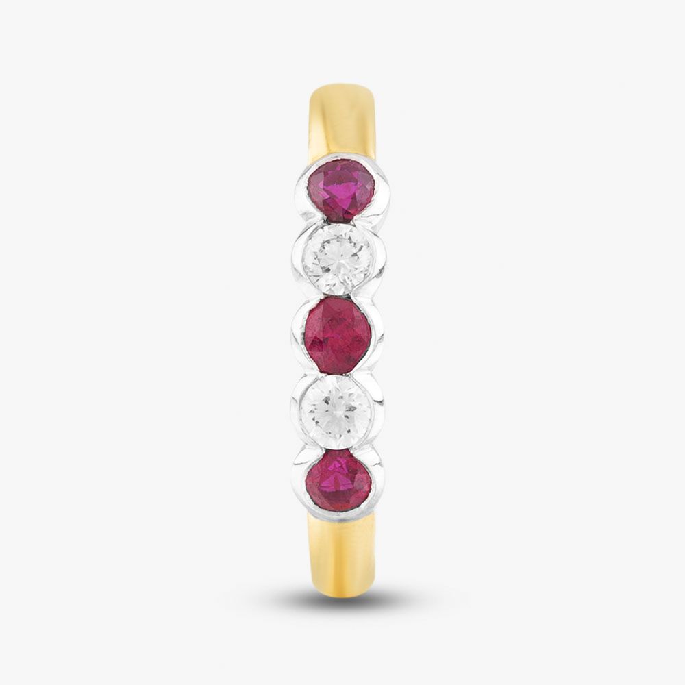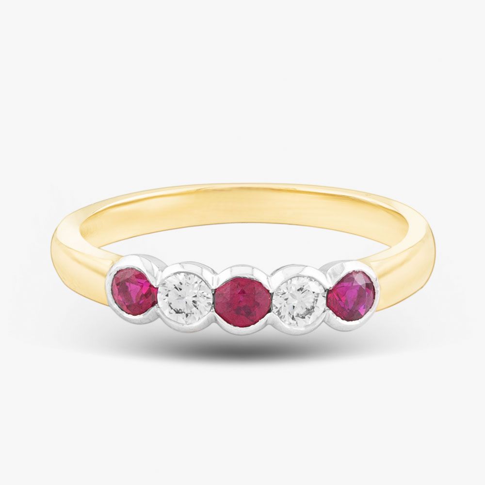 Crafted with a touch of simplicity, this five-stone ring exudes timeless elegance. Delicate 18ct yellow gold embraces brilliant-cut rubies and white diamonds in an alternating pattern, nestled securely in a rubover setting. The perfect accompaniment for any special occasion, this ring promises to leave a lasting impression.