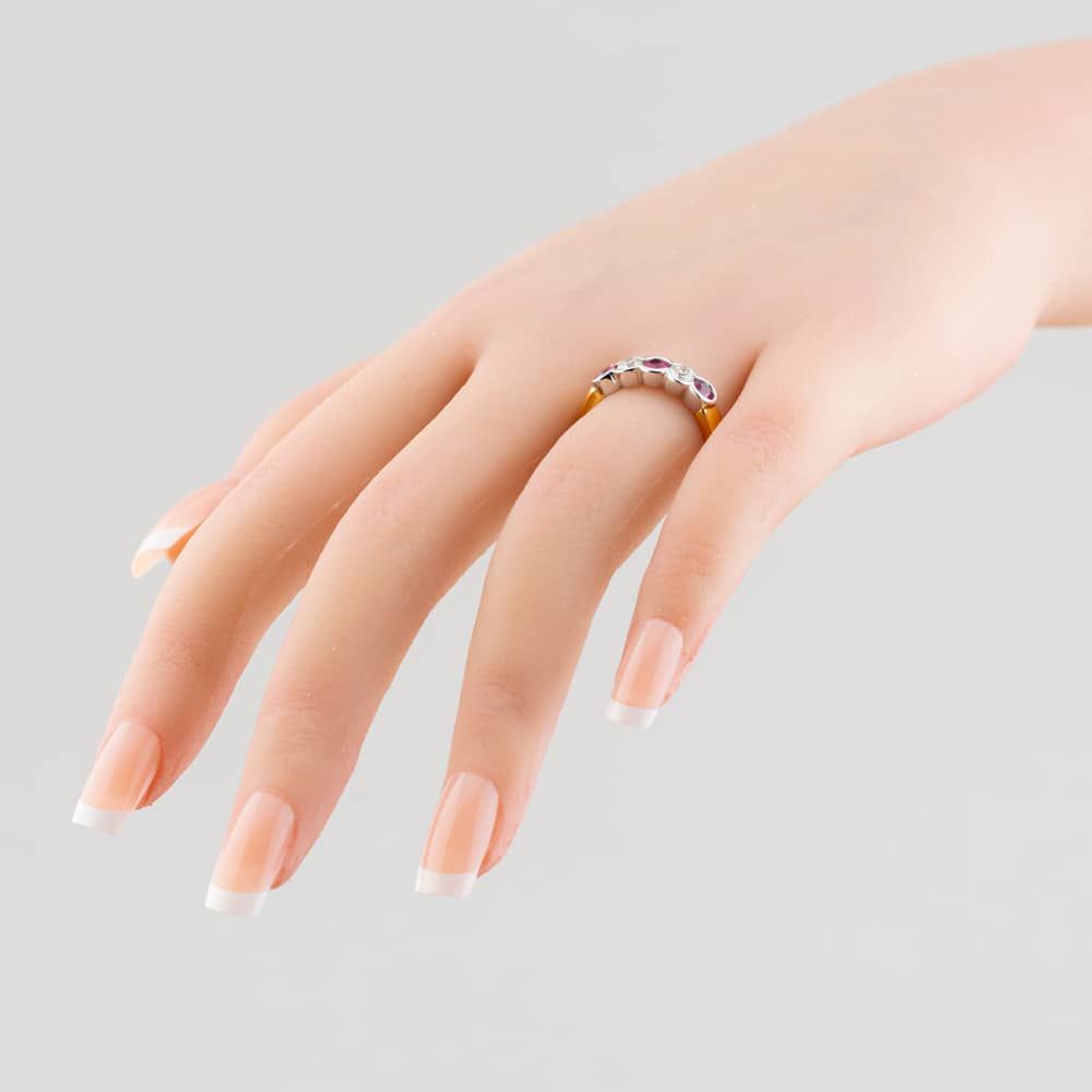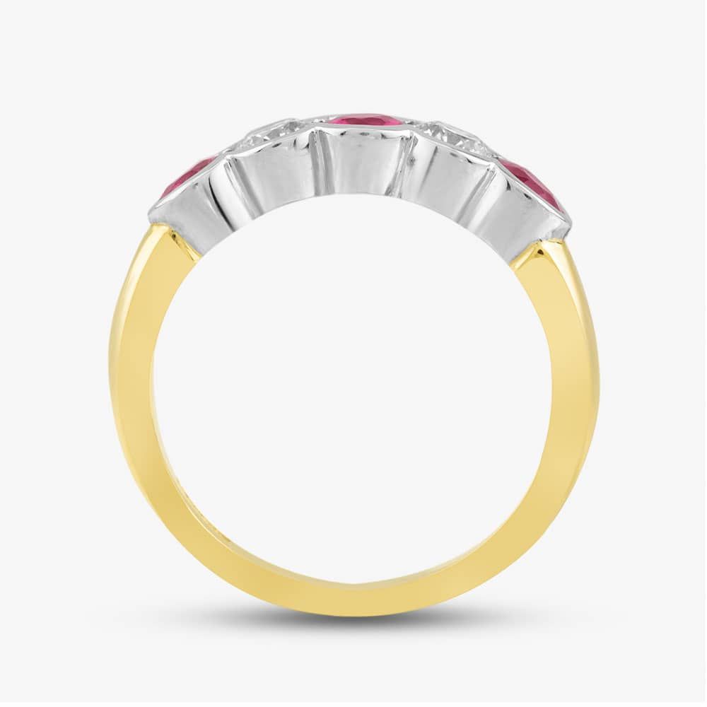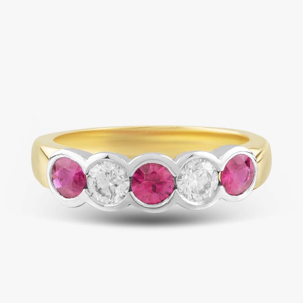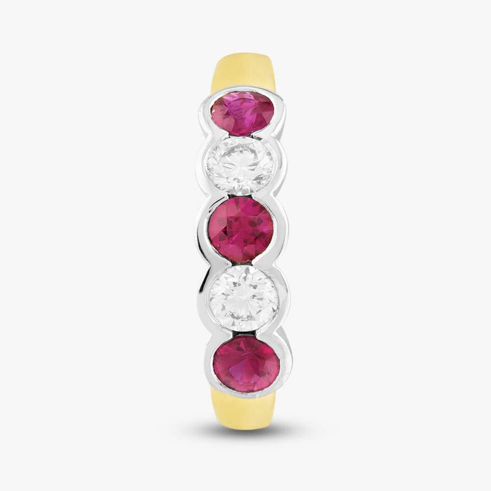Crafted with a touch of simplicity, this five-stone ring exudes timeless elegance. Delicate 18ct yellow gold embraces brilliant-cut ruby and white diamonds in an alternating pattern, nestled securely in a rubover setting. The perfect accompaniment for any special occasion, this ring promises to leave a lasting impression.
