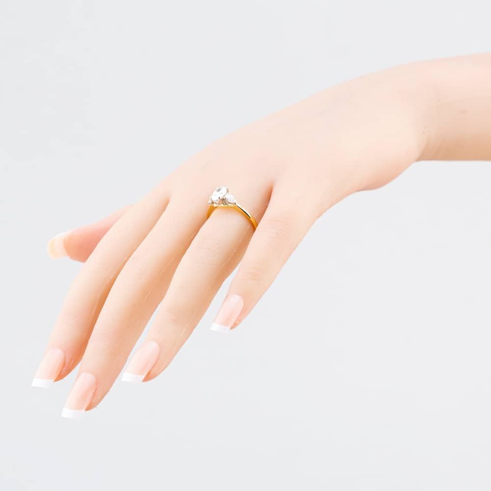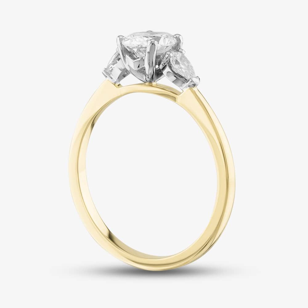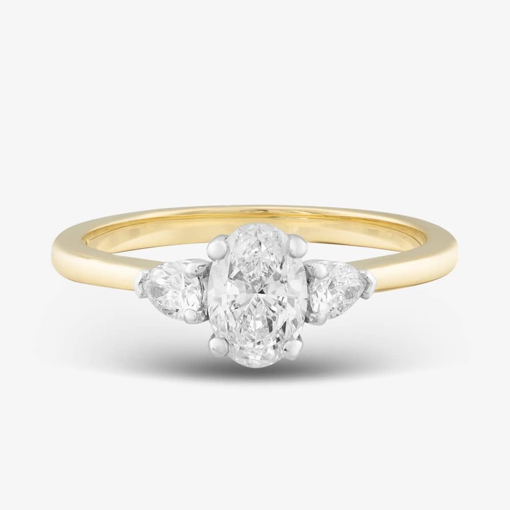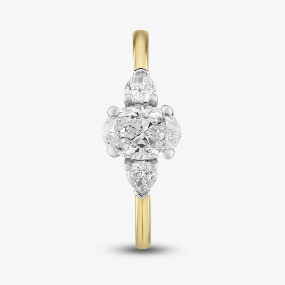 This elegant and timeless design features an 18ct yellow gold band with a luxurious platinum setting that securely holds the dazzling diamonds. At its centre, a certified 0.70ct oval-shaped diamond, graded SI1 clarity and a grade colour of E, radiates brilliance and charm. The centrepiece is gracefully flanked by two exquisite pear-shaped diamonds on either side, with a combined weight of 0.26ct, adding a sophisticated touch to the overall design. The contrasting metals and the interplay of the diamonds create a perfect balance of classic and contemporary style, ideal for a statement piece or a cherished engagement ring.