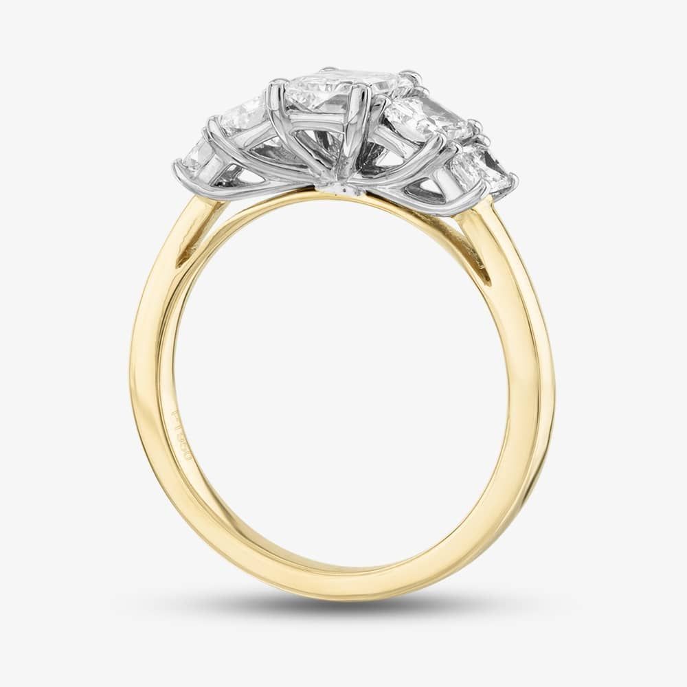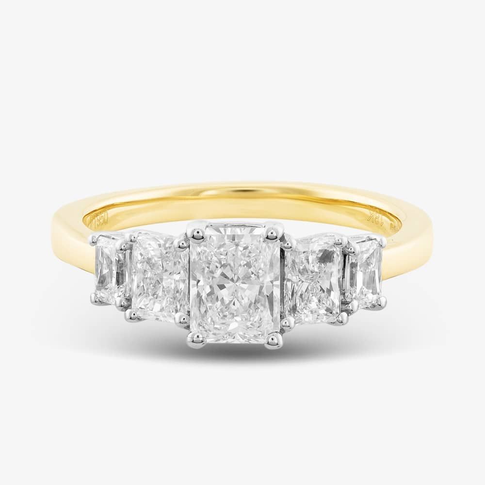 This stunning five-stone ring showcases the perfect harmony of craftsmanship and luxury. The band, crafted in 18ct yellow gold, is complemented by a durable and refined platinum setting that enhances the brilliance of the diamonds. At its heart lies a magnificent 0.75ct radiant-cut diamond, graded VVS2 clarity with a G colour, exuding exceptional brilliance and purity. Flanking the centre piece are two radiant-cut diamonds on each side, with a combined weight of 0.88ct, adding symmetry and sophistication. This exquisite design is a true testament to elegance, making it a timeless treasure.